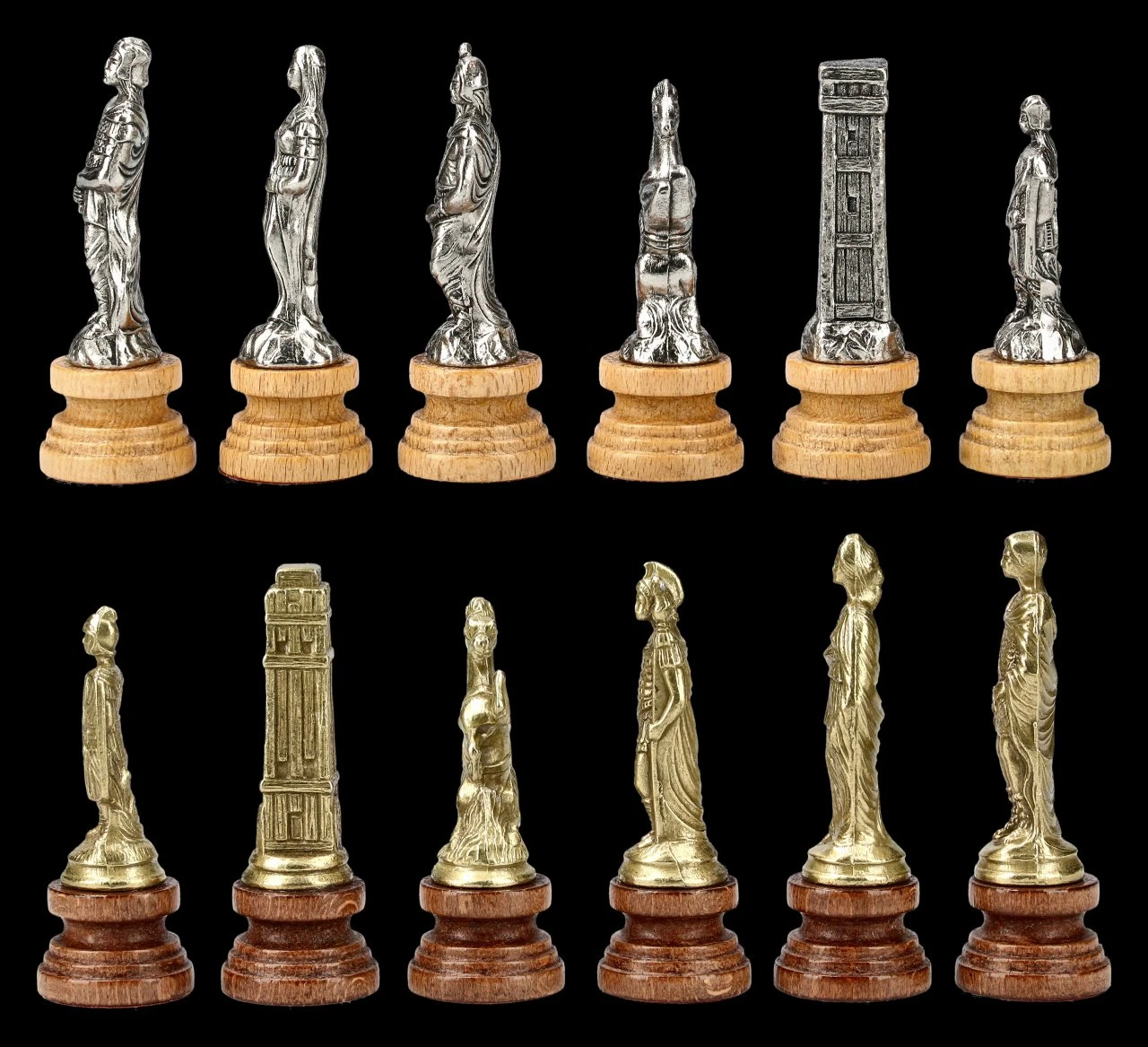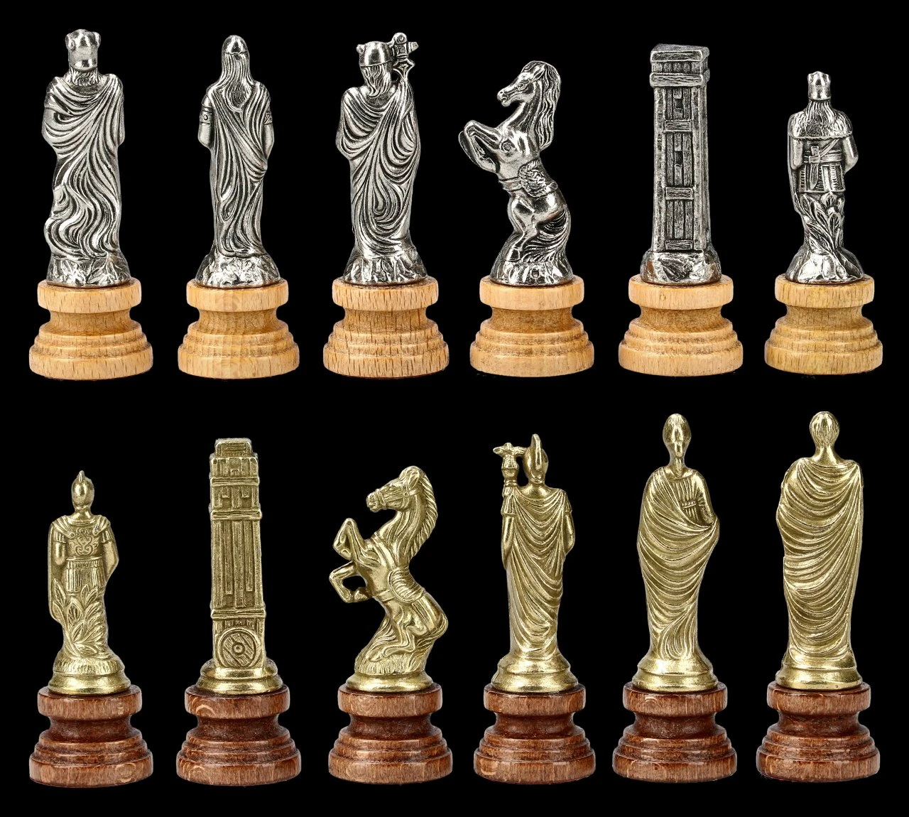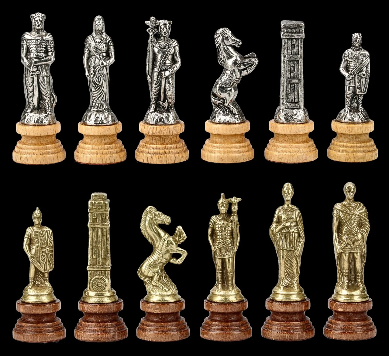 Ausgesprochen schön und edel gestaltete Spielfiguren zeichnen dieses fantastische Schachfiguren Set aus. Römer vs. Barbaren – leicht zu erkennen auch an der feinen Nuancierung in der Bekleidung der Figuren und auch an dem unterschiedlich gestalteten Turm – sind aus Metall gefertigt und haben eine Holz Basis. Die Figuren der Römer sind goldfarben und die der Barbaren silberfarben sorgfältig handbemalt. Die insgesamt 32 Figuren sind zwischen: 8 – 10 cm hoch und die Stellfläche hat einen Durchmesser von 3,5 cm. Das Schachfiguren Set Römer vs. Barbaren ist wunderschön gestaltet und auch ein edles Geschenk für jeden Schachspieler.