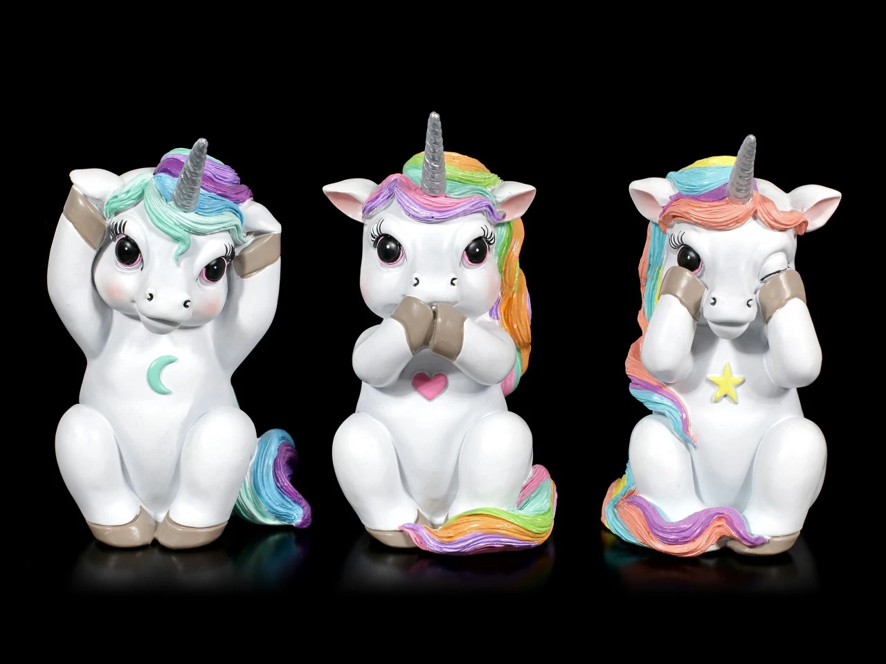 Die süßen drei Regenbogen Einhörner verkörpern Nichts Böses Hören, Sagen, Sehen. Das Kunststein Trio wurde liebevoll handbemalt und ist ein perfektes kleines Mitbringsel oder Geschenk für einen Sammler.