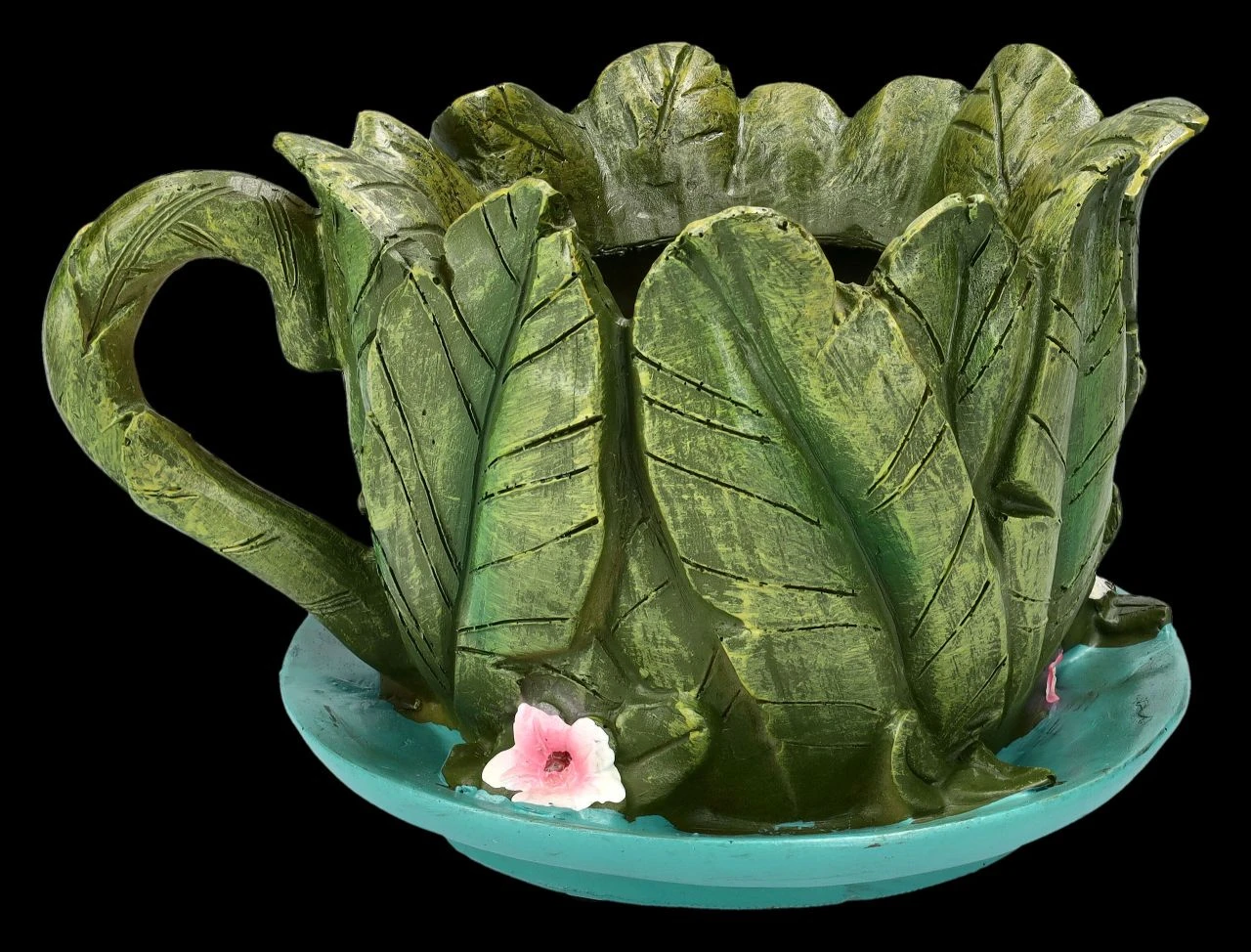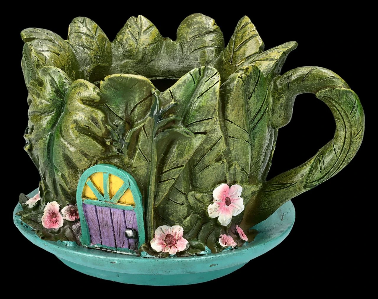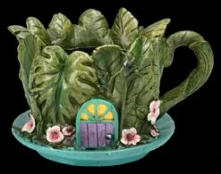 Die Elfe hat eine Kaffeetasse gefunden, mit grünen Blättern umwickelt und geschickt getarnt zu einem Häuschen umgebaut. In diesem niedlichen detailreichen Elfen-Haus aus liebevoll handbemaltem Kunststein (Polyresin) werden sich nicht nur Elfen, sondern auch Pflanzen sofort wohlfühlen. Es ist 12 cm hoch, 19 cm breit und 15 cm tief und kann ein Pflanzentöpfchen mit dem Durchmesser von ca. 9,5 cm aufnehmen. Natürlich kann das putzige Elfen-Haus auch direkt bepflanzt werden, da der Pflanzentopf ein Ablaufloch hat. Für jeden, der die Welt der Elfen liebt, ist dieser fantasievolle Pflanzentopf, der auf jeder Blumenbank zum Blickfang wird, ein absolut zauberhaftes Geschenk.