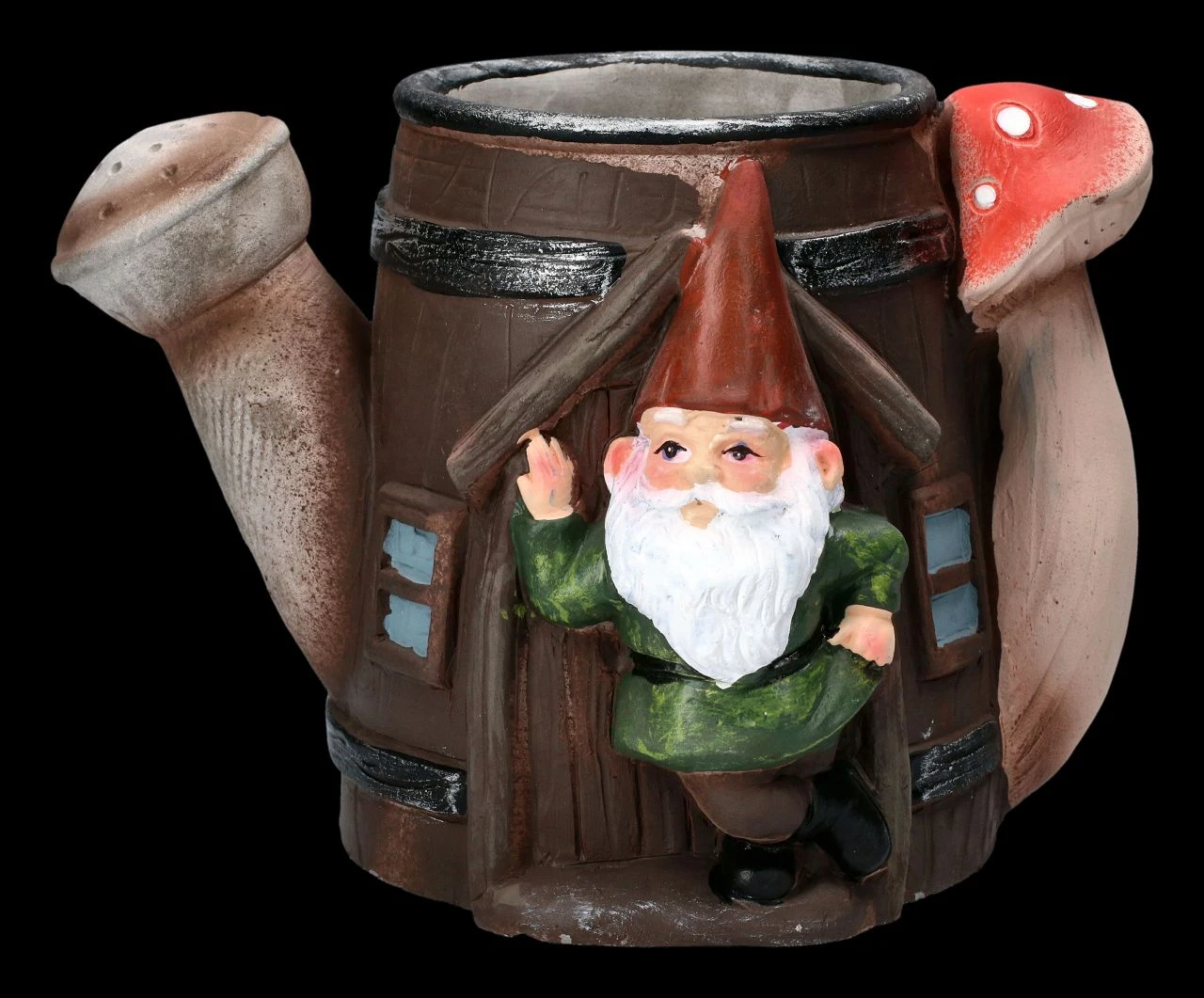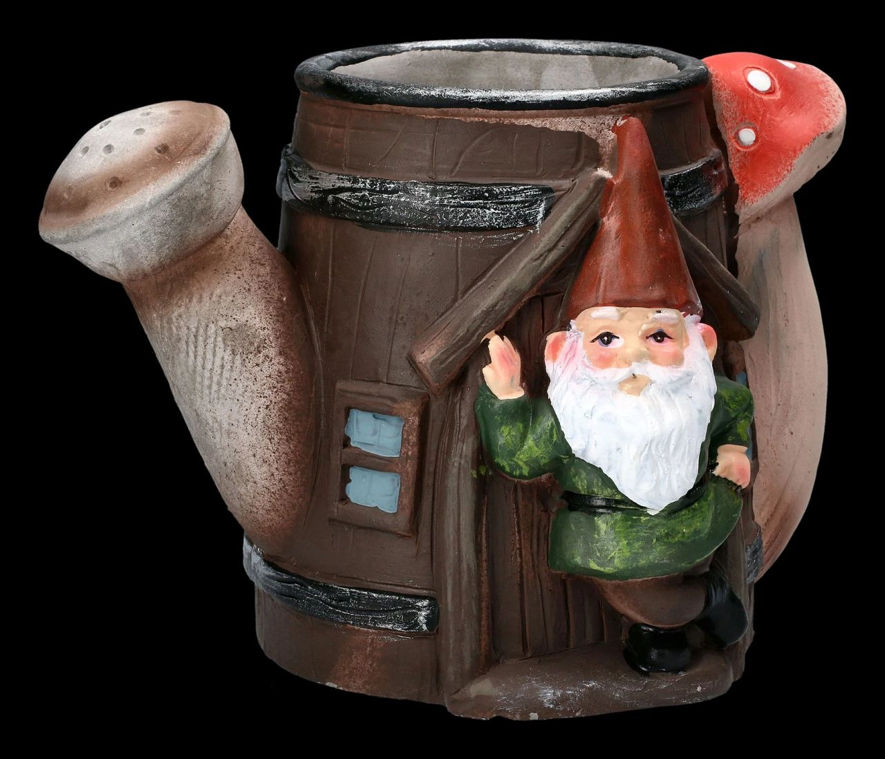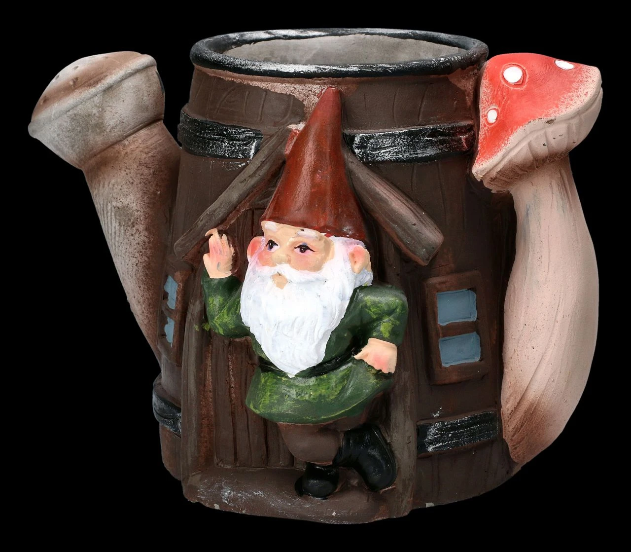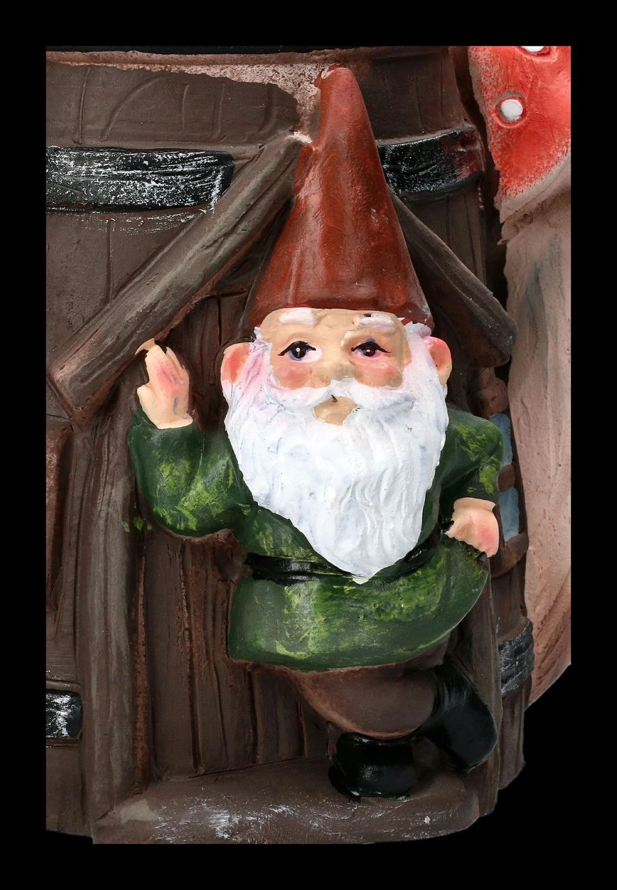 Eine Gießkanne bildet den originellen Pflanztopf mit dem lässig in der Tür lehnenden Gartenzwerg, der freundlich grüßend aus der offenen Tür winkt. Der lustige Pflanztopf ist aus liebevoll handbemaltem Kunststein (Polyresin) gefertigt und 14 cm hoch, 19 cm breit und 13 cm tief. Er kann ein Blumentöpfchen mit einem Durchmesser bis 7,5 cm aufnehmen und hat kein Ablaufloch. Der Pflanztopf mit dem Gartenzwerg in der Gießkanne ist eine echt witzige Deko für jede Blumenbank und ein nettes Geschenk, wenn man damit seine Blumen überreicht.