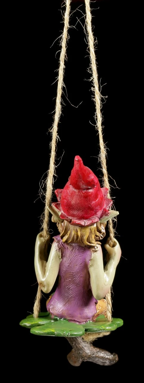 Glücklich strahlend sitzt der kleine Pixie Kobold auf seiner Schaukel. Er liebt das Schaukeln und das Gefühl zu fliegen. Die Pixie Figur ist zum Hängen geeignet, denn nur so kann er schaukeln.
