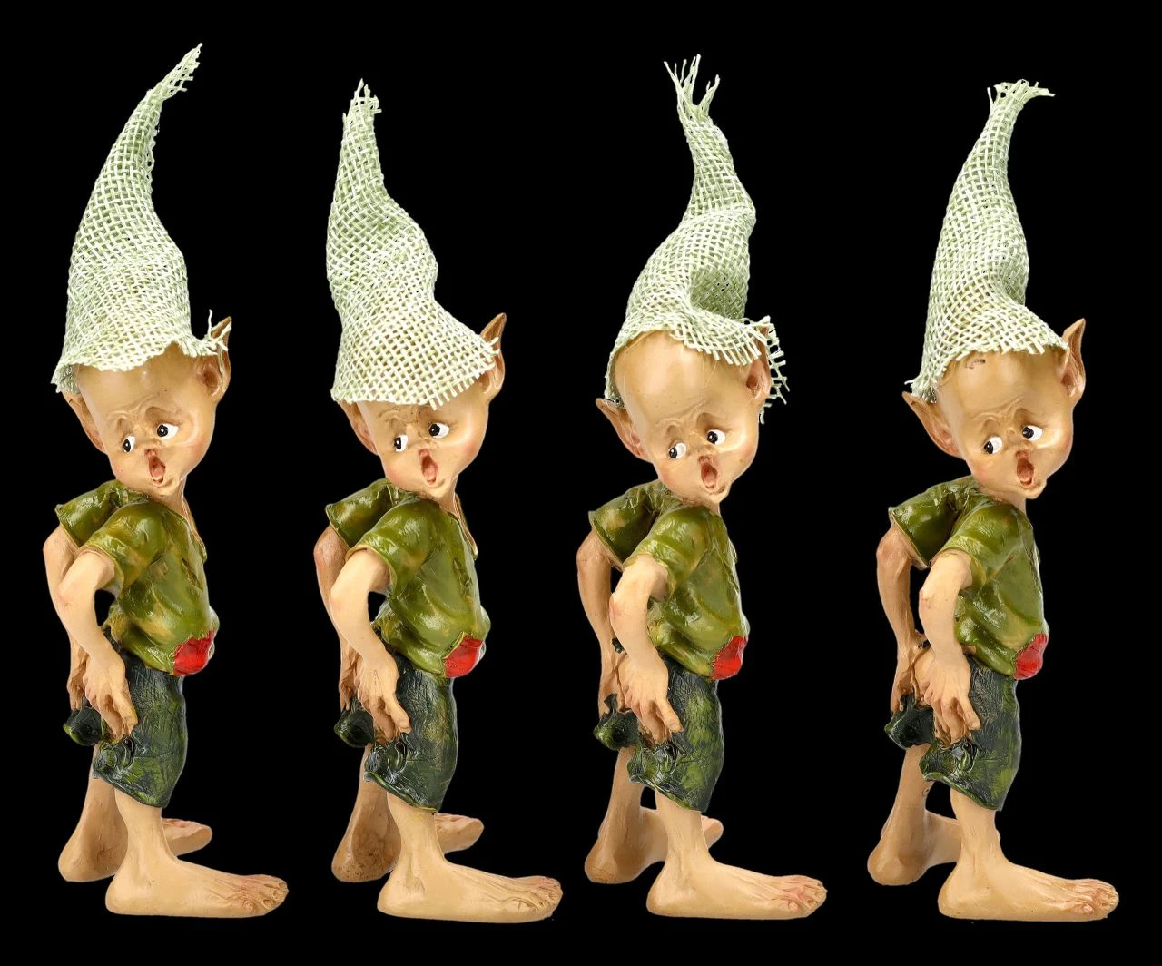 Oh Mann, was hat die freche Bande da wieder angestellt? Die Mutter der vier Frechdachse wird sich vermutlich nicht gerade freuen, wenn sie die zerrissenen Hosen entdeckt. Mit beiden Händen versuchen die kleinen Pixie Kobolde das große Loch in ihrer Hose zu verdecken. Die witzigen Pixie Kobolde wurden aus liebevoll handbemaltem Kunststein (Polyresin) gefertigt und sind je 13 cm hoch, je 4 cm breit und je 5,5 cm tief. Sie kommen im 4er Set und sind für jeden Pixie-Sammler ein richtig niedliches Geschenk und können vielleicht auch gleich mit Freunden geteilt werden. Sammler finden übrigens in unserem Shop weitere lustige Pixie-Figuren.