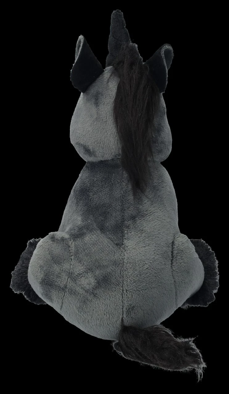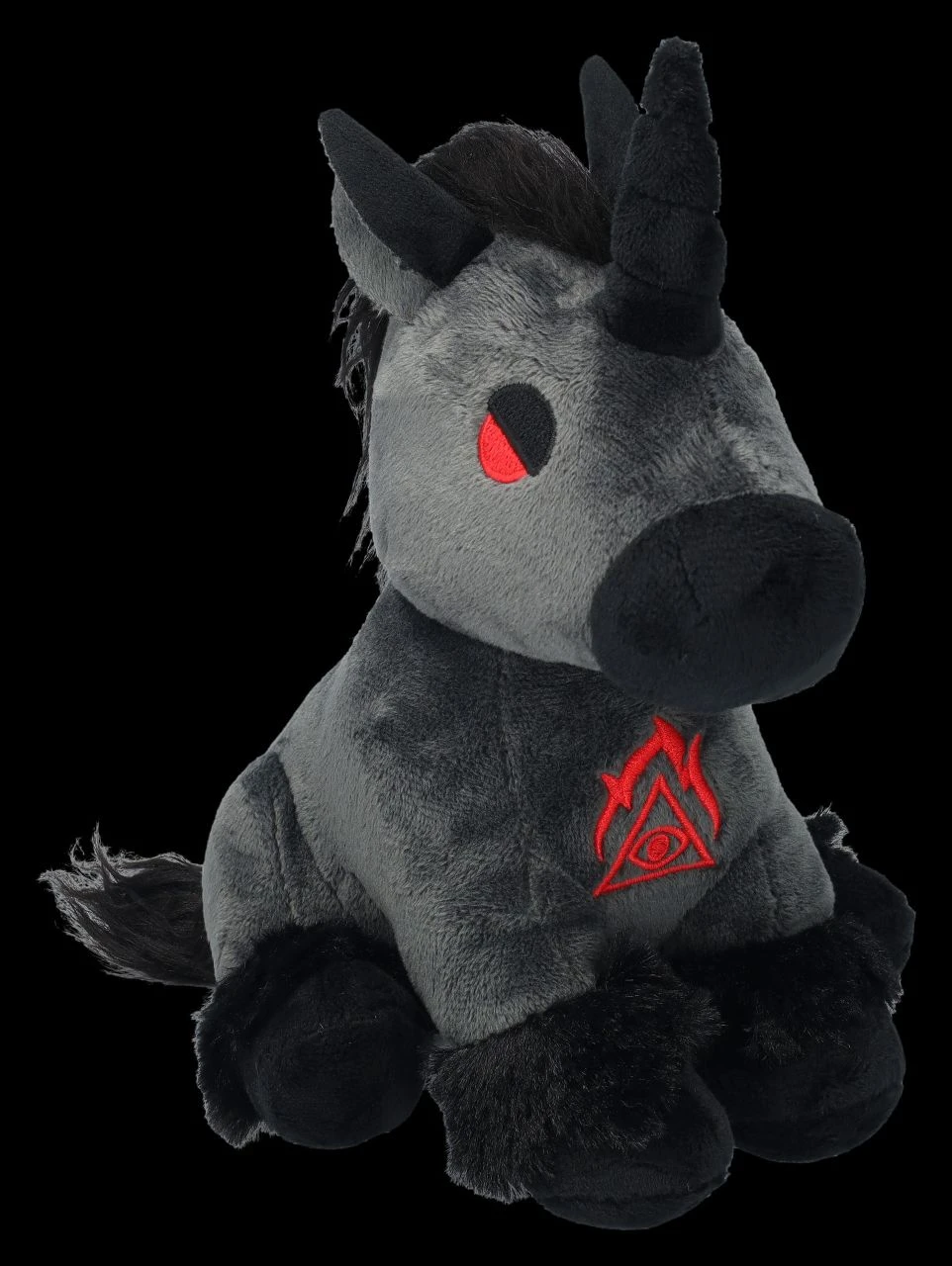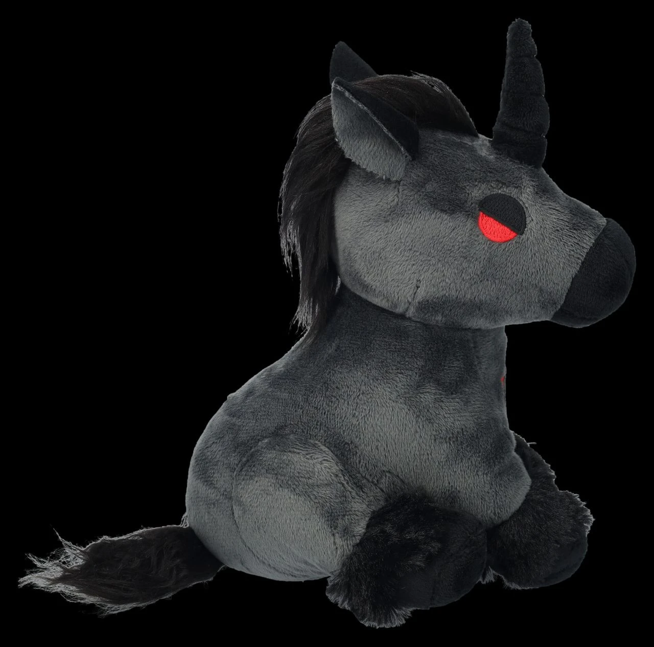 Das schwarze Einhorn zeigt wieder einmal, warum Einhörner nicht so leicht entdeckt werden. Wie man an dem roten Mal auf der Brust und den blutroten Augen sehen kann, gehört es zum geheimnisvollen Club der Gothic-Kuscheltiere. Das dritte Auge in dem Zeichen zeigt vermutlich, dass es den Blick für die Zwischenwelt hat. Das putzige Plüschtier aus kuschelig weichem 100 % Polyester ist 21 cm hoch, 14 cm breit und 17 cm tief. Für Babies und Kleinkinder ist das niedliche Einhorn nicht geeignet, aber wer sagt denn, dass nur Kinder Kuscheltiere haben dürfen…. Mit den anderen Kuscheltieren aus dieser Reihe bildet es gleich eine tolle Gemeinschaft und ist zum Sammeln das perfekte Geschenk.