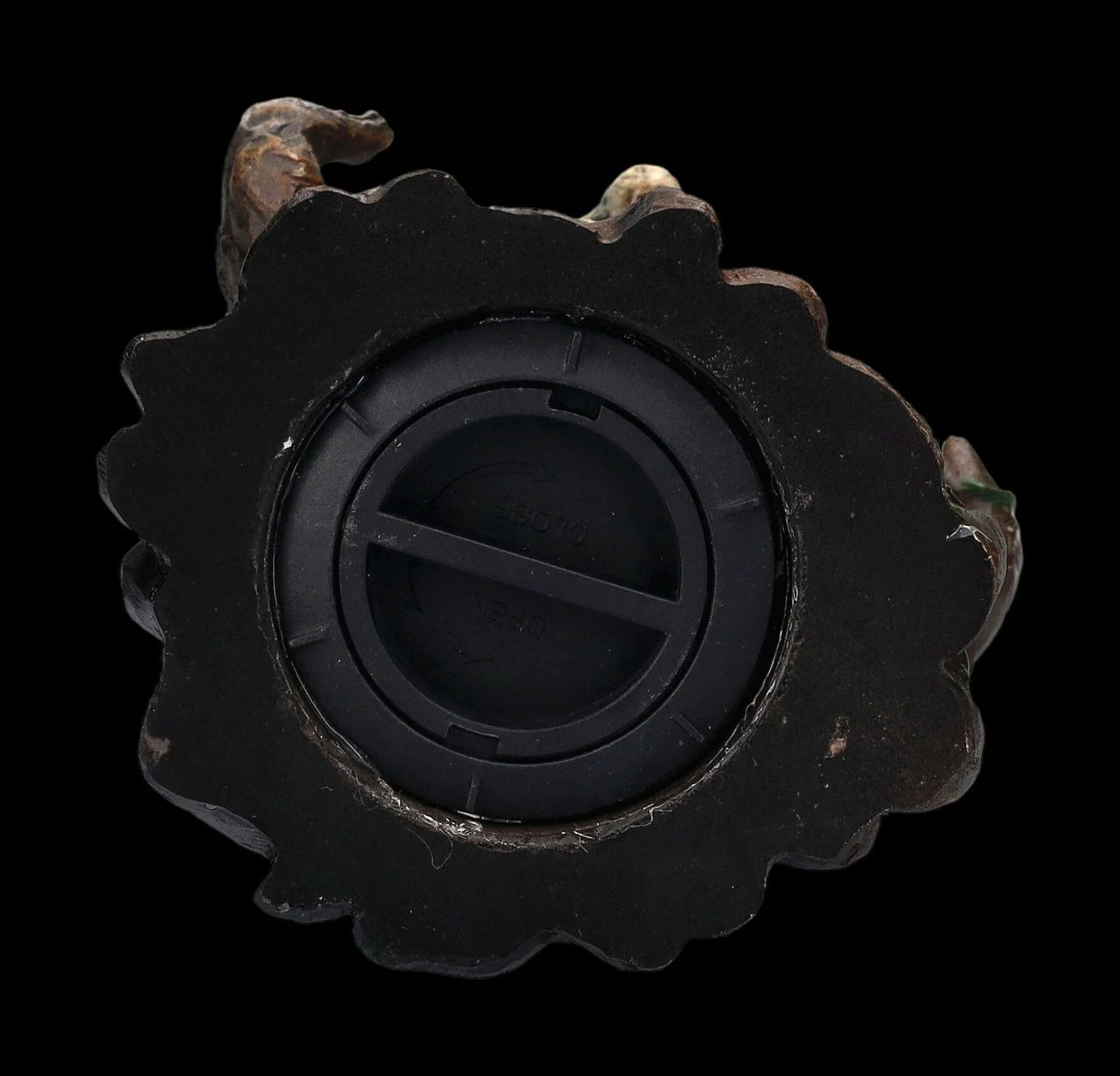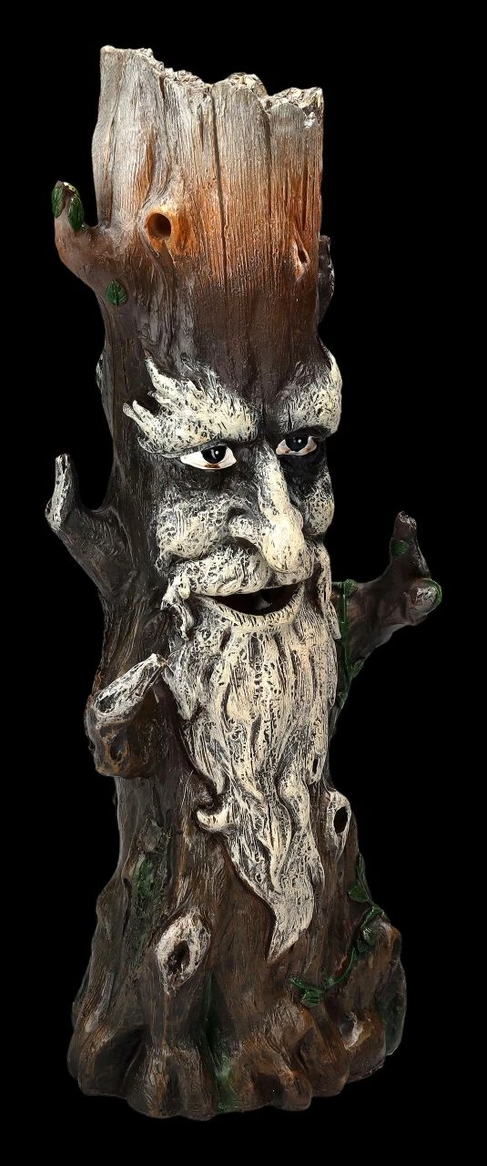 Was will er erzählen, der Greenman Ent König, wenn das Räucherstäbchen brennt und seinen Kopf in duftenden Nebel hüllt? Der 30,5 cm hohe, 12 cm breite und 10,5 cm tiefe fantasievolle Räucherhalter aus handbemaltem Kunststein (Polyresin) hat in dem Baumstumpf auf dem Kopf des Greenmanss eine Halterung für Räucherstäbchen, die jedoch nicht in der Lieferung enthalten sind. Eine große Auswahl an verschiedenen Wohlfühldüften finden Sie in unserem Shop.