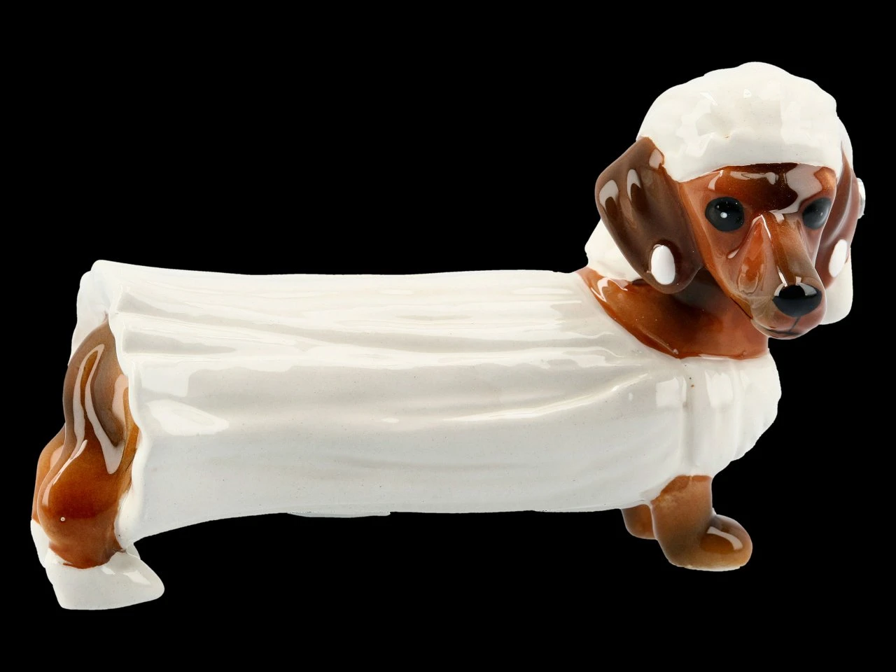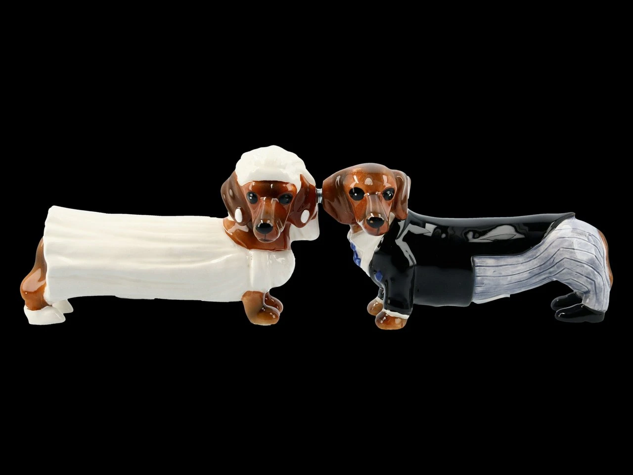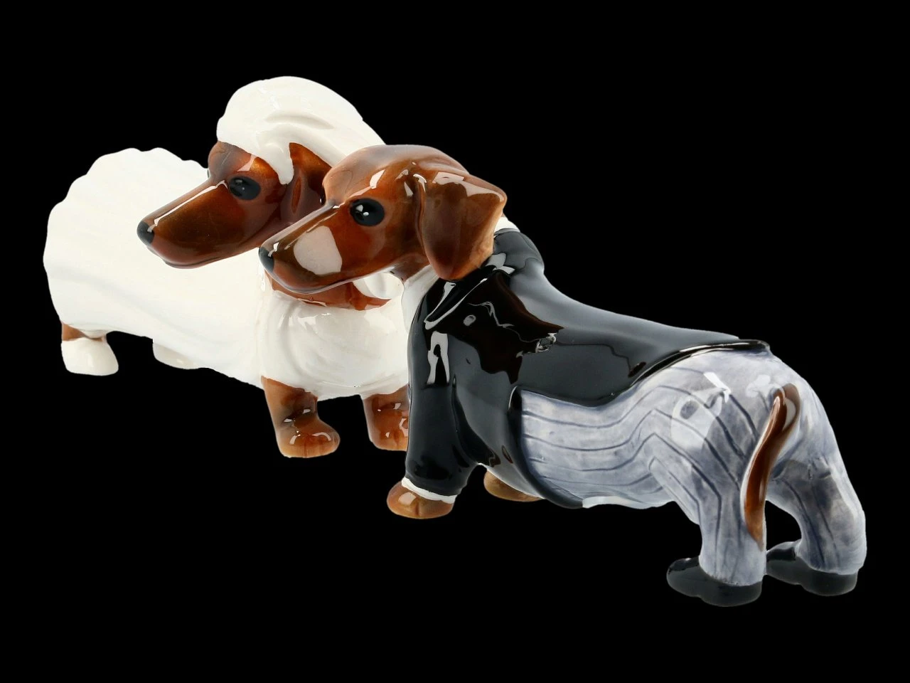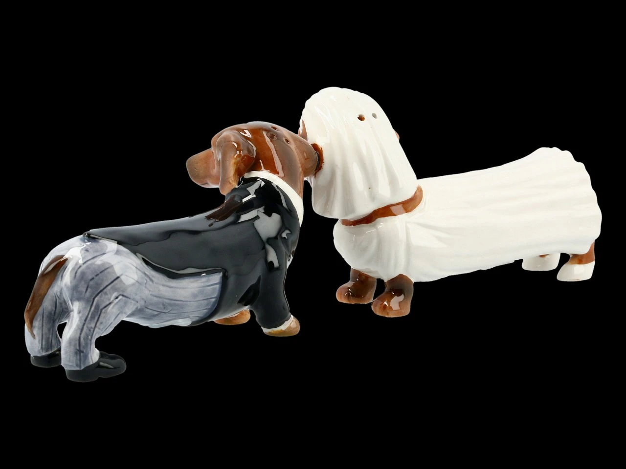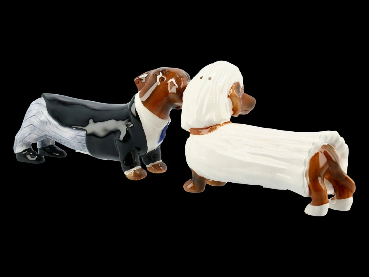 Bei diesem niedlichen Brautpaar muss doch das Herz eines jeden Dackelbesitzers höher schlagen. Die beiden süßen Dackel als Salz- & Pfefferstreuer werden auf Ihrem Tisch alles andere in den Schatten stellen. Ein Magnet hält die beiden Dackel aus liebevoll handbemalter Keramik zusammen. Die Höhe der beiden ist je 7 cm, die Breite je 12 cm und die Tiefe ist je 6,5 cm. Diese witzigen Dackel Braut und Bräutigam als Salz- & Pfefferstreuer sind nicht nur für Dackelbesitzer ein tolles Geschenk.