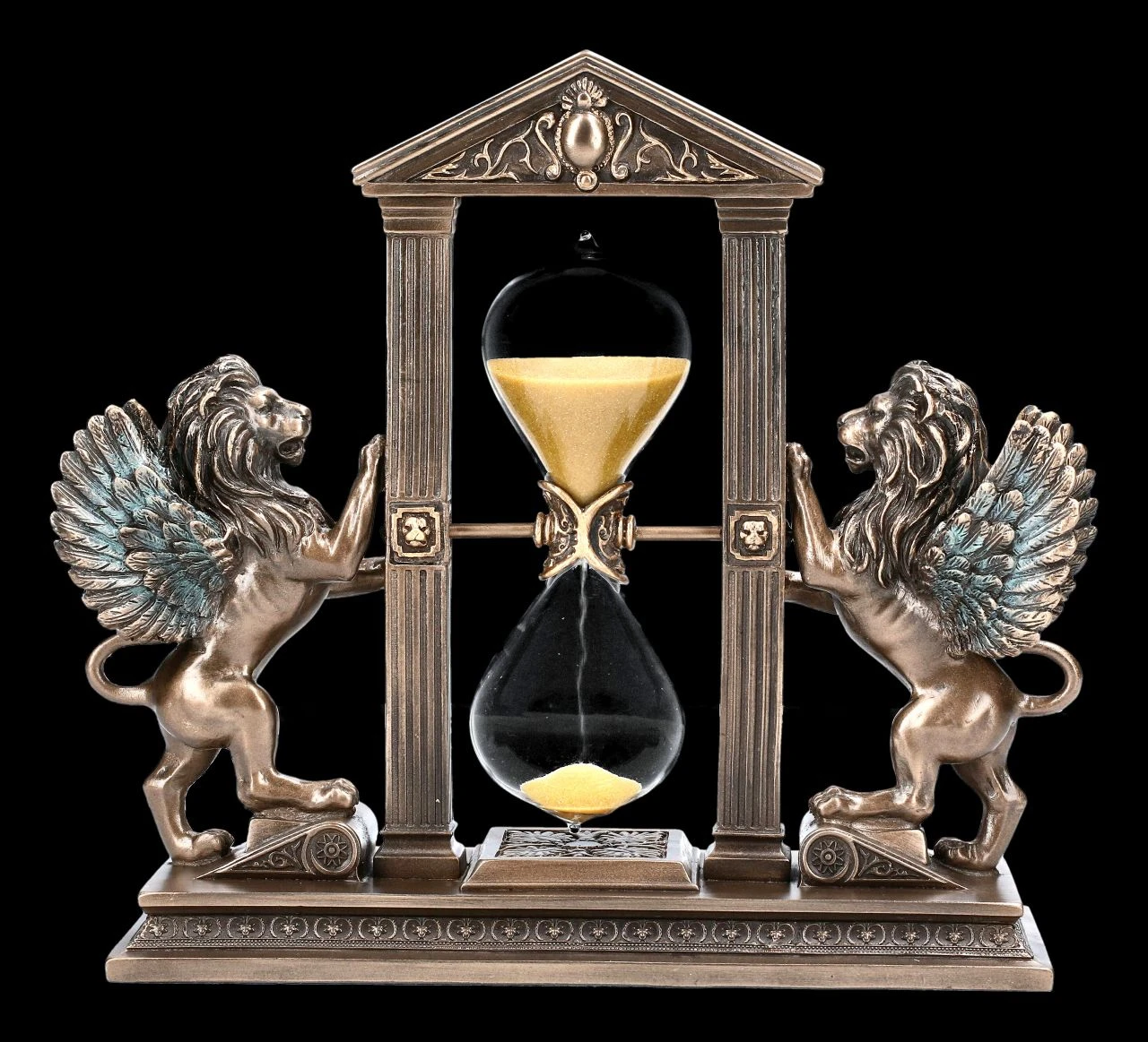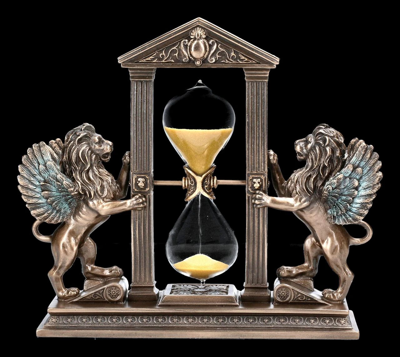 Ob auf dem Kaminsims, der Fensterbank, dem Schreibtisch oder im Regal – diese außergewöhnliche Sanduhr mit den beiden geflügelten Löwen aus bronziertem und coloriertem Kunststein (Polyresin) und Glas ist überall ein edler Blickpunkt. Die schön gestaltete Sanduhr von Veronese ist 18 cm hoch, 20 cm breit und 7 cm tief. Sie ist bis in die einzelnen Details sehr sorgfältig dargestellt und damit sicher ein besonderes Geschenk.