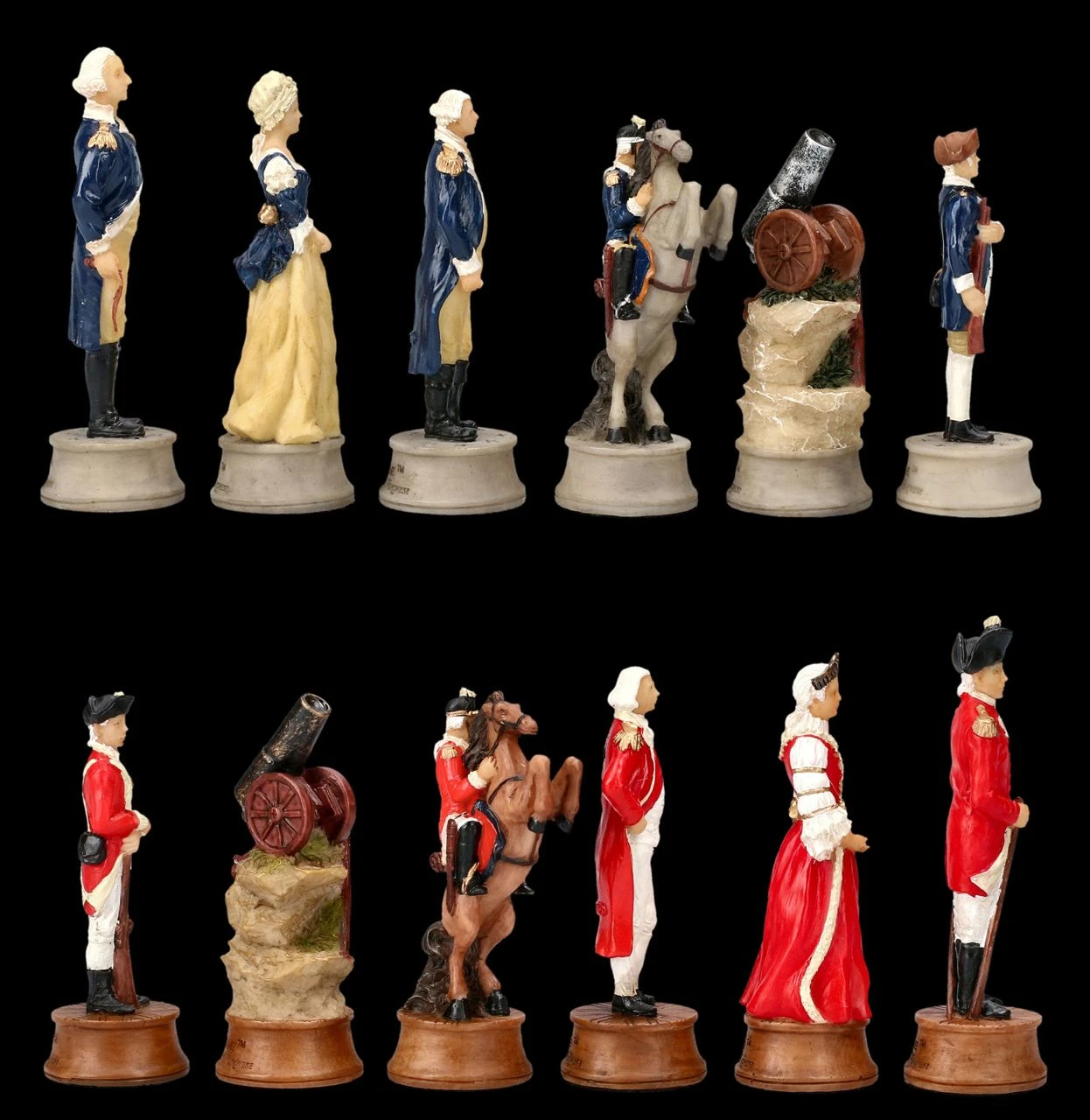 Der Amerikanische Unabhängigkeitskrieg zwischen den Kolonien und der britischen Kolonialmacht dauerte von 1775 bis 1783 und wurde letztendlich von den Kolonien gewonnen. Nach der Ratifizierung der Unabhängigkeitserklärung durch den Kongress am 4. Juli 1776 in Philadelphia wurden die Kolonien zum ersten Mal als Vereinigten Staaten von Amerika bezeichnet. Dieses Ereignis wird bis heute mit den berühmten Paraden gefeiert. Mit diesem fantastischen Schachspiel von Veronese können die Spieler mit ihrem Können entscheiden, wer nun gewinnt. Außerordentlich detailreich aus Kunststein (Polyresin) gefertigt und sorgfältig handbemalt zeigen diese Schachfiguren auf der einen Seite die Angehörigen der Kolonien der Vereinigten Staaten in deren Uniformen und die Gegenseite die englischen Kolonialherren. Das fantastische Schachfiguren Set, bei dem die Türme durch Kanonen dargestellt werden, beinhaltet 32 Figuren, wobei zum Beispiel der König 8 cm hoch ist und die Bauernfigur 6,5 cm. Die Figuren dieses Sets haben eine Stellfläche von 2,6 cm. Weitere fantastische Schachfiguren – auch als wunderbares Geschenk für Schachspieler – finden Sie in unserem Shop.