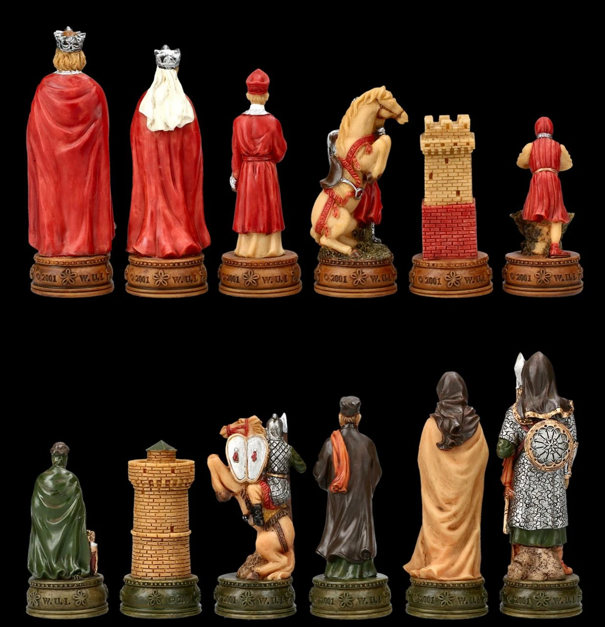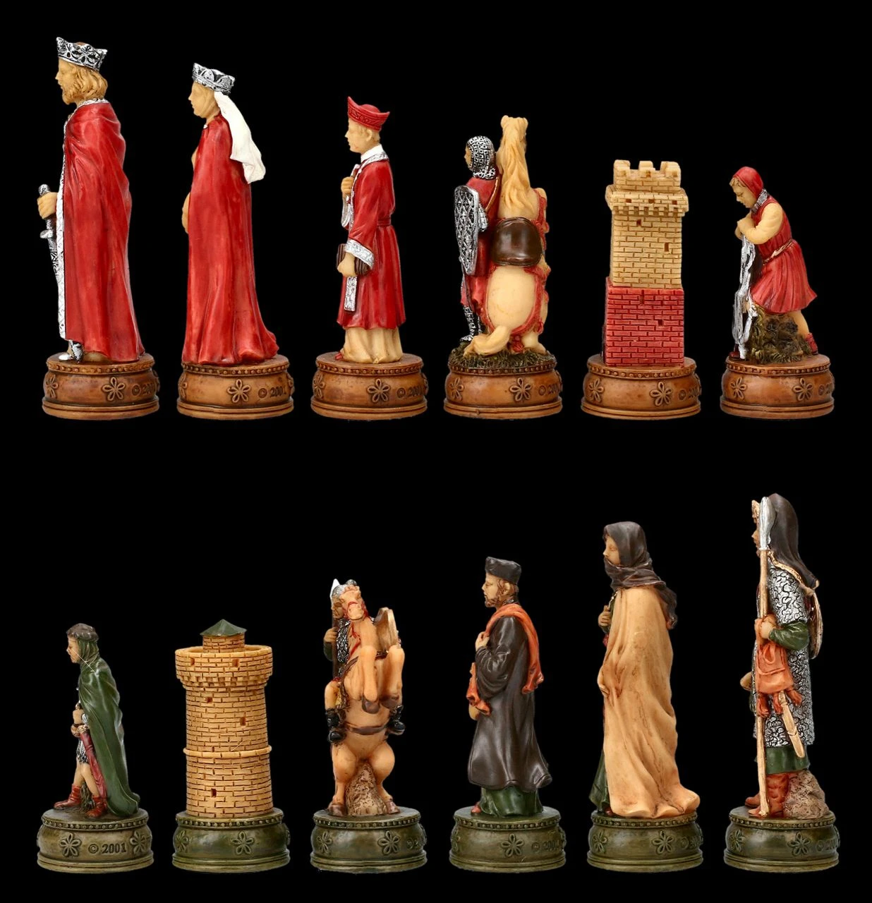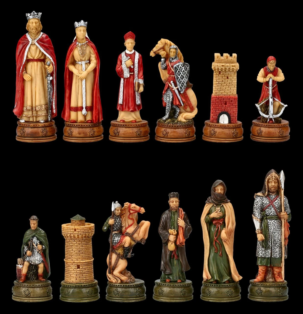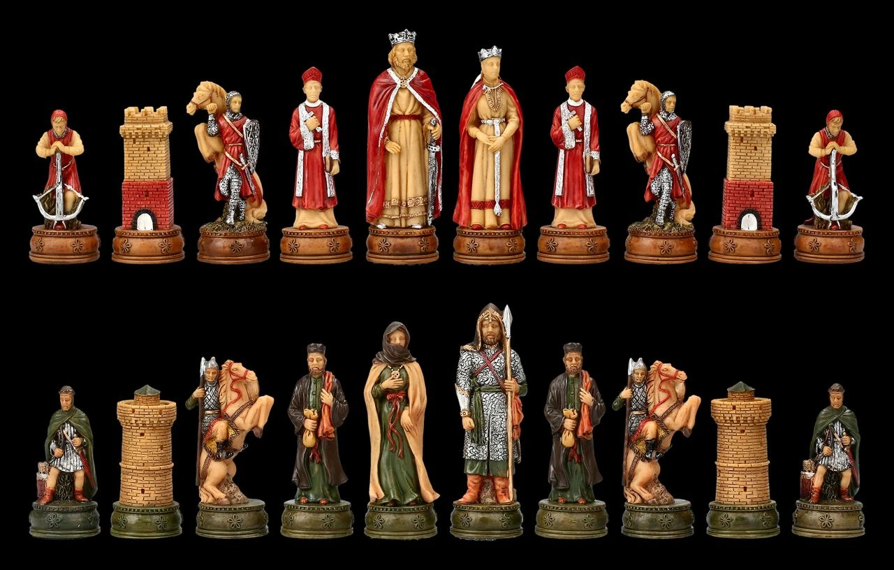 Diese handbemalten Figuren sind das perfekte Geschenk. Seit der 1135 verfassten Geschichte der Könige Britanniens die erste ausführliche Version der Geschichte um Artus zum Inhalt hatte, beflügelt die Sagenwelt um Camelot und König Artus die Phantasie aller, die sich für das Mittelalter und die Geschichte um König Artus und seinen Kampf gegen die Angeln und Sachsen interessieren. Mit den faszinierenden und großartigen Schachfiguren kann sich jeder Spieler nach Camelot träumen. Denn wie jedes Spiel fördert auch das Schachspiel die Kreaitivität und Fantasie. Bis zur Kleidung und den Ritterrüstungen wunderbar detailreich aus Kunststein (Polyresin) gefertigt und sorgfältig handbemalt, zeigen diese fantastischen Schachfiguren auf der einen Seite König Artus und die seinen in Rottönen und auf der anderen Seite die Figuren der Gegenseite in Grüntönen. Das faszinierende Schachfiguren Set beinhaltet 32 Figuren, wobei zum Beispiel die Königsfigur jeweils 8 cm hoch ist und die Bauernfigur jeweils 6,5 cm. Die Figuren dieses fantastischen Sets haben eine Stellfläche von 2,7 cm. Weitere fantastische und als prachtvolles Präsent geeignete Schachfiguren finden Sie in unserem Shop
