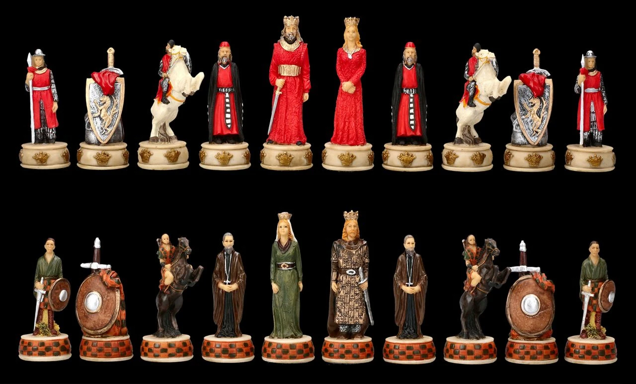 Bonnie Prince Charlie, der Enkel des vertriebenen Königs James II, brachte die schottischen Highland Clans dazu, einen Aufstand gegen die englischen Regierungstruppen zu unternehmen. Er führte die Jakobiten in den Kampf gegen die Engländer, bis 1746 in der kurzen Schlacht von Culloden der Aufstand von der Übermacht der Engländer brutal und vernichtend geschlagen wurde. Diese Schlacht ist bis heute das Trauma der Schotten. Doch so spannend wie der Kampf Engländer vs.Schotten war, kann auch das Schachspiel mit diesen großartigen Figuren werden. Schließlich siegt Können und Achtsamkeit und das kann auf beiden Seiten vorhanden sein. Wunderbar detailreich aus Kunststein (Polyresin) gefertigt und sorgfältig handbemalt zeigen diese fantastischen Schachfiguren auf der einen Seite die Engländer in Rottönen und auf der anderen Seite die Figuren der schottischen Jakobiten in Grüntönen. Das faszinierende Schachfiguren Set beinhaltet 32 Figuren, wobei zum Beispiel die Königsfigur jeweils 8 cm hoch ist und die Bauernfigur jeweils 6,5 cm. Die Figuren dieses fantastischen Sets haben eine Stellfläche von 2,8 cm. Weitere fantastische Schachfiguren – auch als prachtvolles Präsent – finden Sie in unserem Shop.