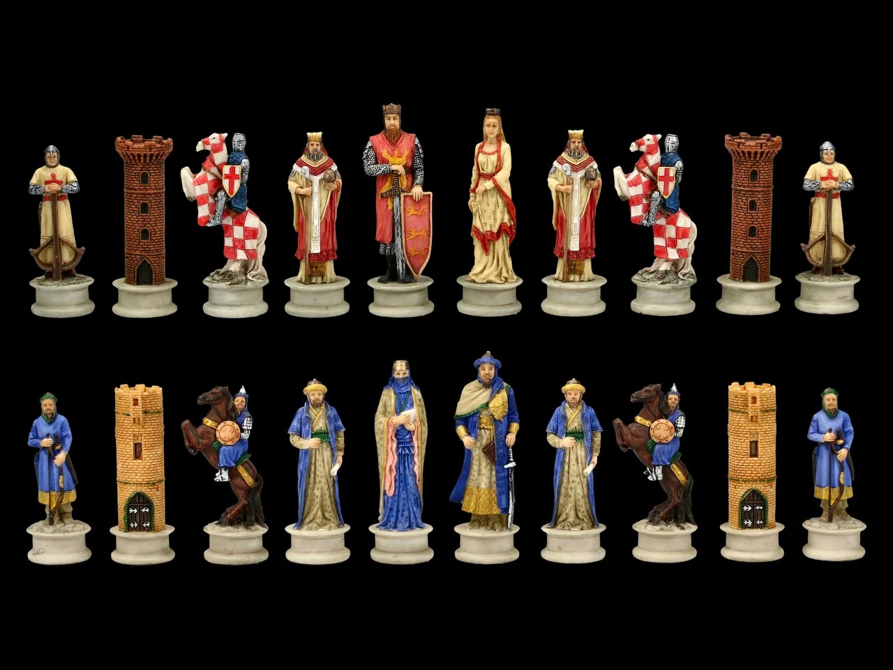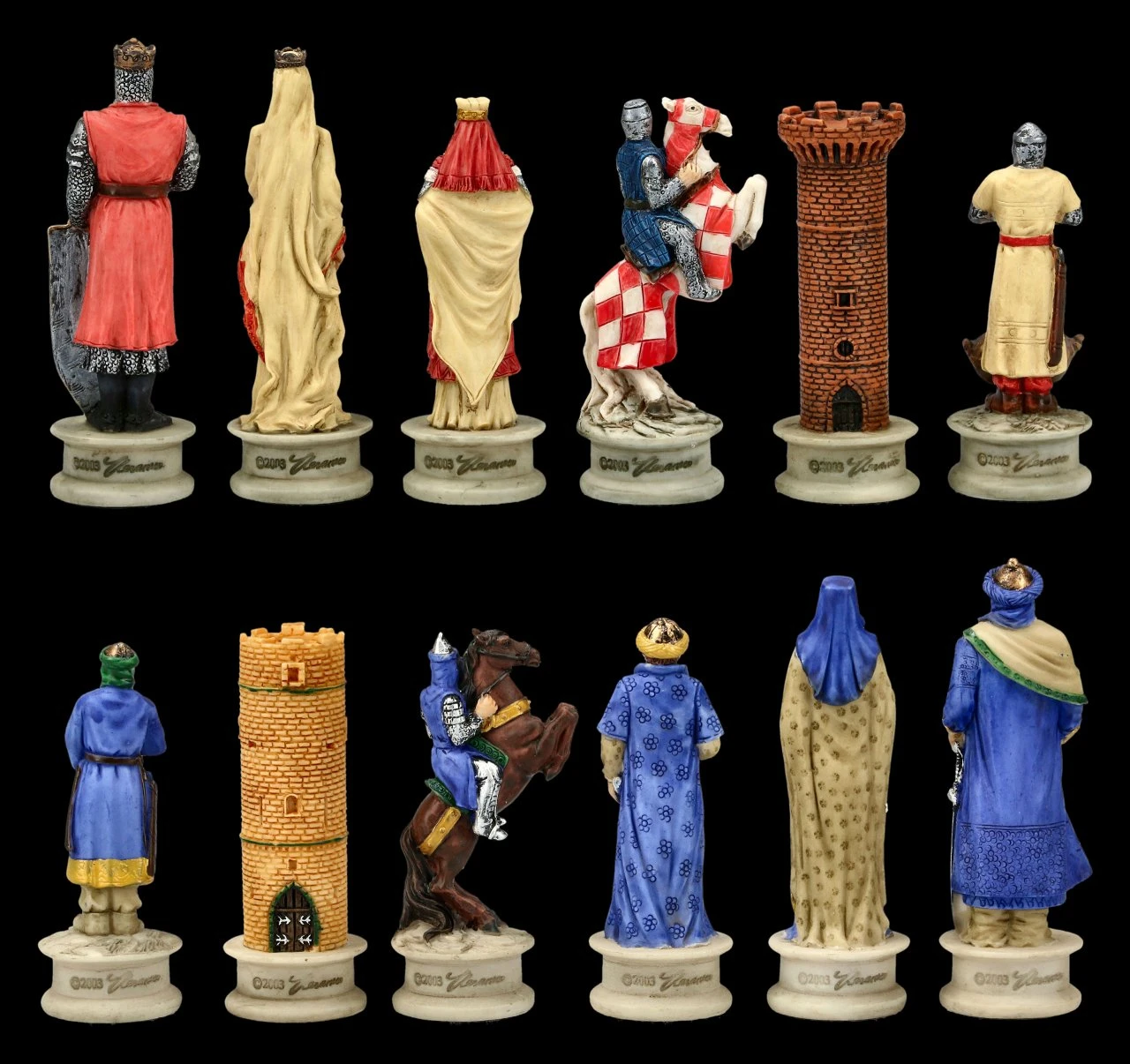 Bei diesem wunderbaren und sorgfältig handbemalten Schachfiguren-Set aus dem Hause Veronese kämpfen Kreuzritter gegen die Sarazenen. Die Schachfiguren sind außerordentlich detailreich aus Kunststein (Polyresin) gefertigt. 32 fantastische Spielfiguren zeichnen dieses tolle Schachfiguren Set Kreuzritter vs. Srazenen aus. Die sehr schön gestalteten Figuren dieses Sets mit den Burg-Türmen sind zwischen 6,5 und 8 cm hoch. Das Podest als Stellfläche hat einen Durchmesser von 2,5 cm. Für alle Kreuzritter-Fans unter den Schachspielern ist dieses großartige Schachfiguren Set auch ein perfektes Geschenk.