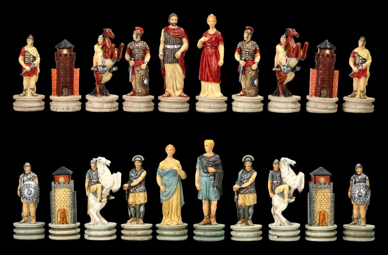 Immer wieder sind die römischen Legionen und die griechische Phalanx in Kämpfen aufeinander getroffen. Durch ihre Wendigkeit, der eisernen Speerspitze und durch ihr Kurzschwert für den Nahkampf waren die Römer immer wieder im Vorteil. So spannend wie der Kampf Römer vs. Griechen kann auch das Schachspiel mit diesen fantastischen Figuren ausgehen. Wunderbar detailreich aus Kunststein (Polyresin) gefertigt und sorgfältig handbemalt zeigen diese fantastischen Schachfiguren auf der einen Seite die Römer mit ihrem Heerführer und den Angehörigen in Rottönen und auf der anderen Seite die Figuren der Griechen in Blautönen. Das faszinierende Schachfiguren Set beinhaltet 32 Figuren, wobei zum Beispiel die Königsfigur jeweils 8 cm hoch ist und die Bauernfigur jeweils 6,5 cm. Die Figuren dieses Sets haben eine Stellfläche von 2,8 cm. Weitere fantastische, als prachtvolles Präsent geeignete Schachfiguren finden Sie in unserem Shop
