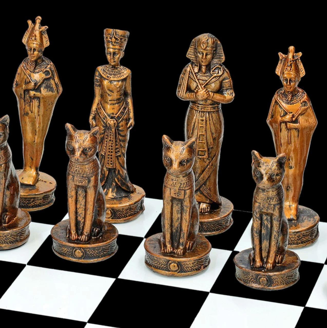 Als Octavian und Marcus Antonius um die Vorherrschaft in Rom kämpften, wurde Marcus Antonius von seiner Geliebten, der Ägyptischen Königin Kleopatra, unterstützt. Doch 30 v. Chr. siegte Octavian und wurde als Augustus der erste Käiser Roms. Wer den Ptolemäischen Krieg also gewonnen hat, wissen wir aus der Geschichte, aber wer bei diesem Schachspiel siegt, wird erst dann entschieden, wenn es Schachmatt heißt. Auf dem 38 x 38 cm großen Spielbrett aus Glas stehen sich bei dem Turnier die Ägypter in Gold und die Römer in Silber gegenüber. Schach ist ein Geduldsspiel und Geduld ist angesagt, wenn auf dem 30,5 x 30,5 cm großen Spielfeld mit den 4 x 4 cm großen Feldern der Kampf beginnt. Das Schachbrett aus Glas und die 32 detailreich aus Kunststein (Polyresin) gefertigten und von Hand bemalten Figuren sind bei diesem faszinierenden Schachspiel mit dabei. Die Figur der Könige ist 8,5 cm hoch, die Bauern der Ägypter, dargestellt von Bastet, der Katzengöttin im alten Ägypten, sind 6 cm hoch und die Bauern der Römer, dargestellt durch römische Legionäre, sind 7 cm hoch. Die Stellfläche der Figuren ist jeweils 2,5 cm. Das Schachspiel mit den Figuren Ägypter vs. Römer ist ein perfektes Geschenk für alle, die sich für die Geschichte interessieren und natürlich für jeden, der das Spiel der Könige zu einem Erlebnis machen möchte..