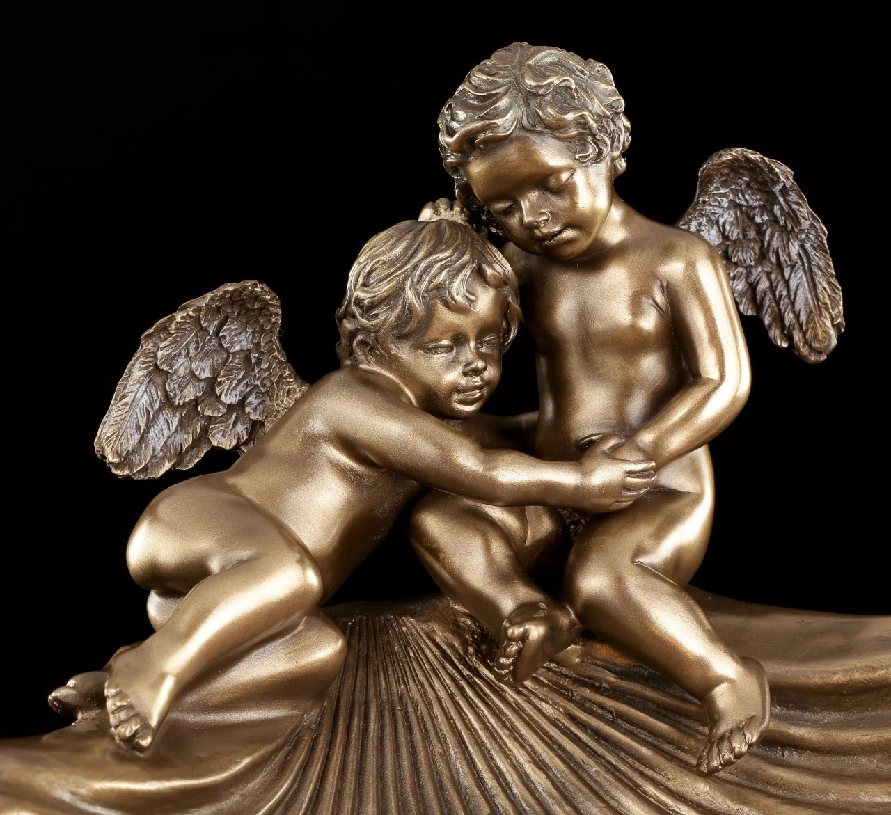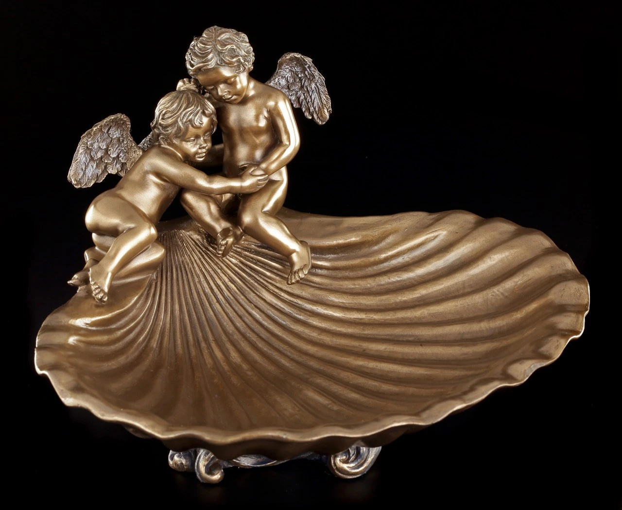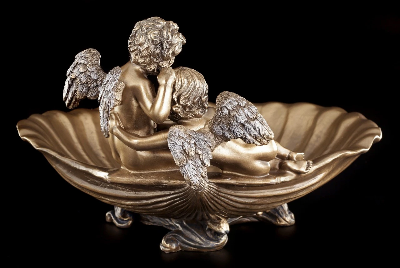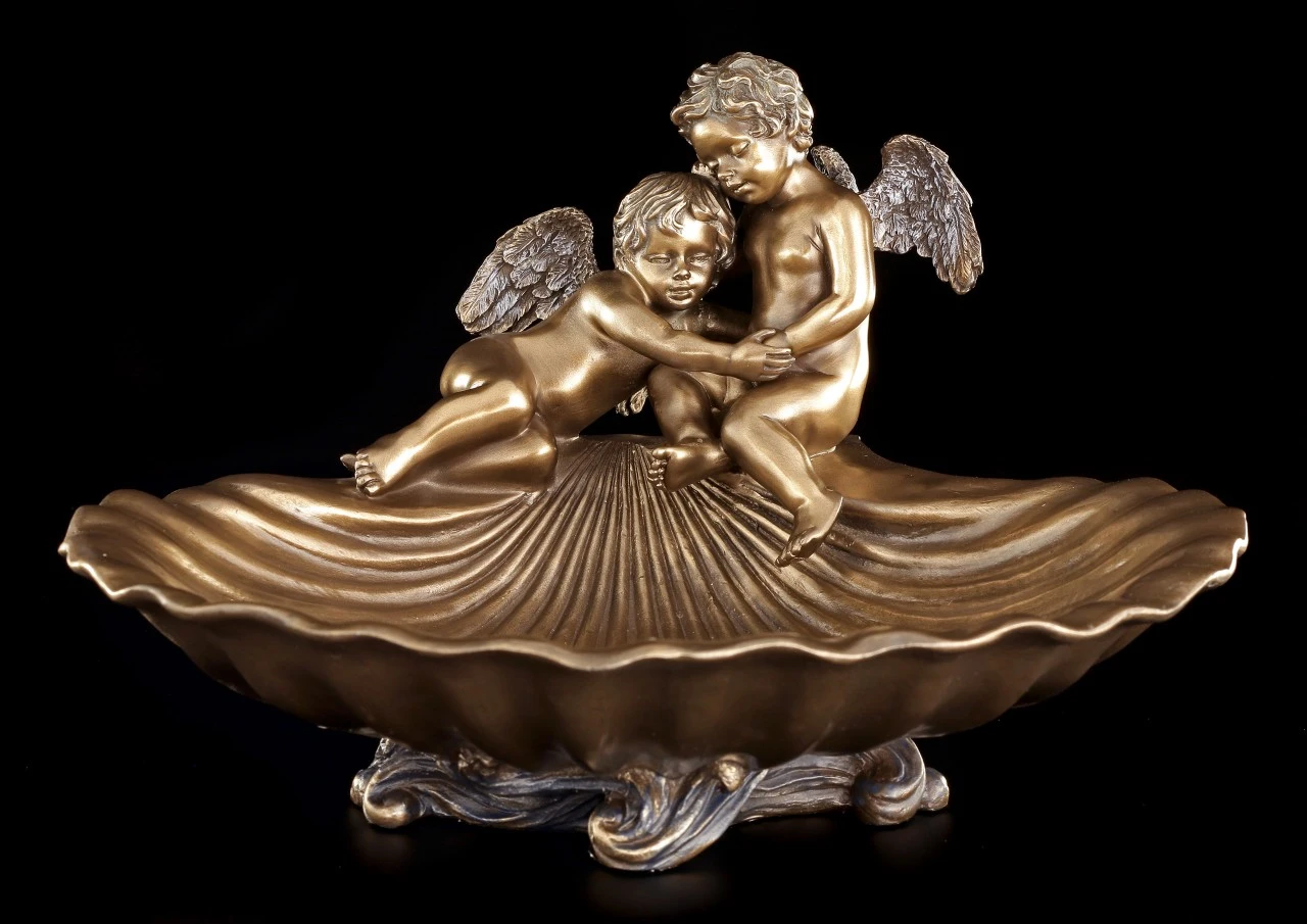 Diese schöne Schale wird zu dem Hingucker auf einem Tisch. Zwei kleine Engel sitzen an dem Rand einer Muschel. Die Bronzierung lässt die Schale im Licht sanft glänzen. In dieser Schale lassen sich kleine Wertsachen sicher und stilvoll ablegen.