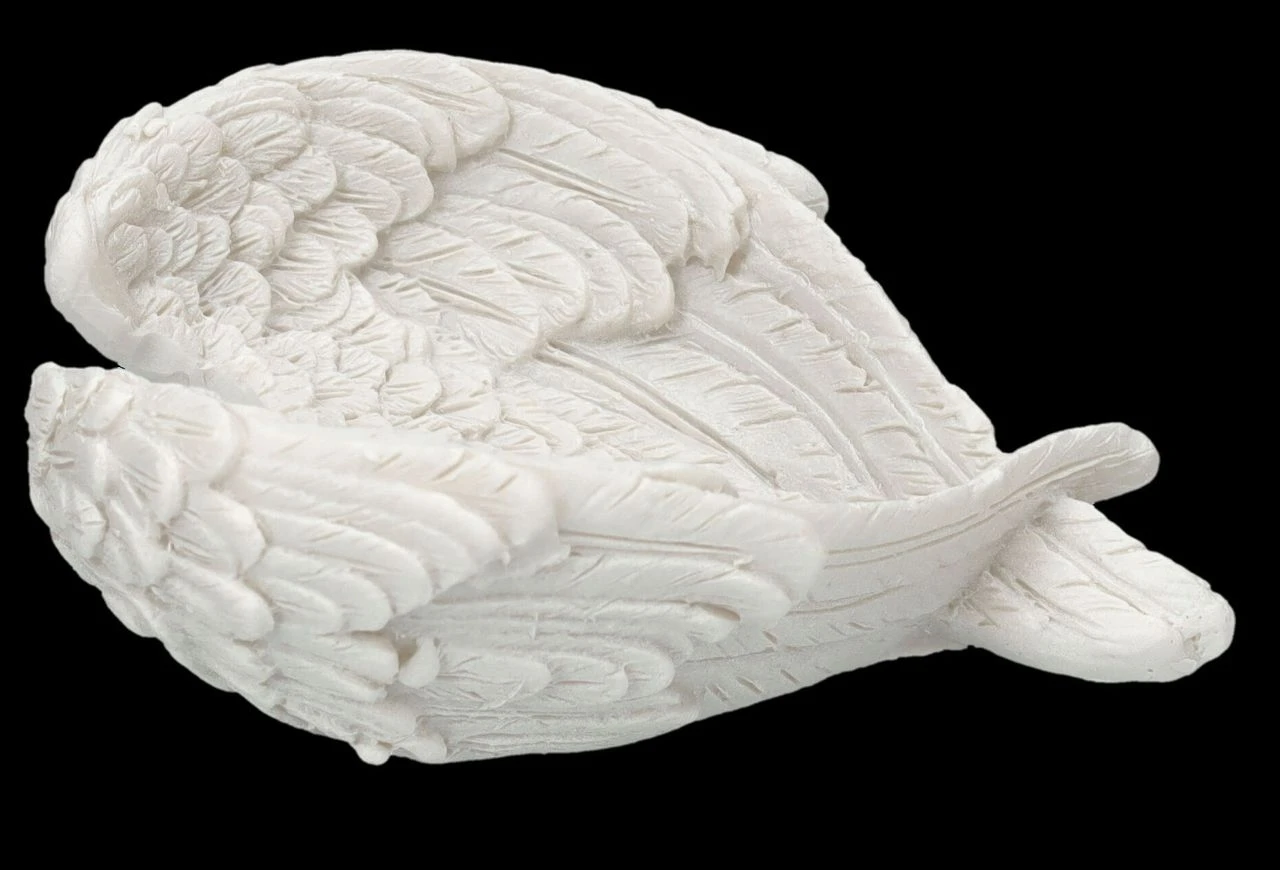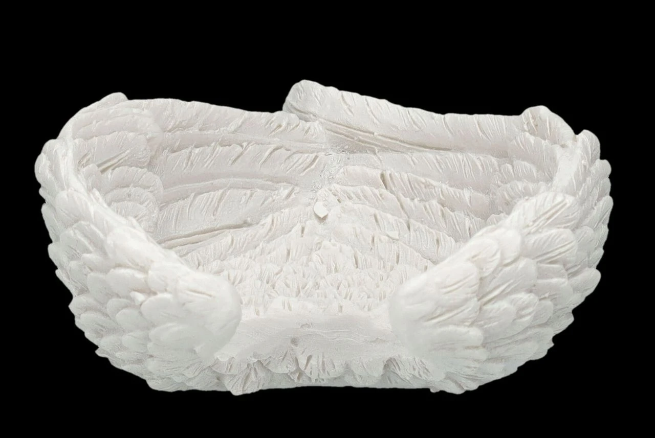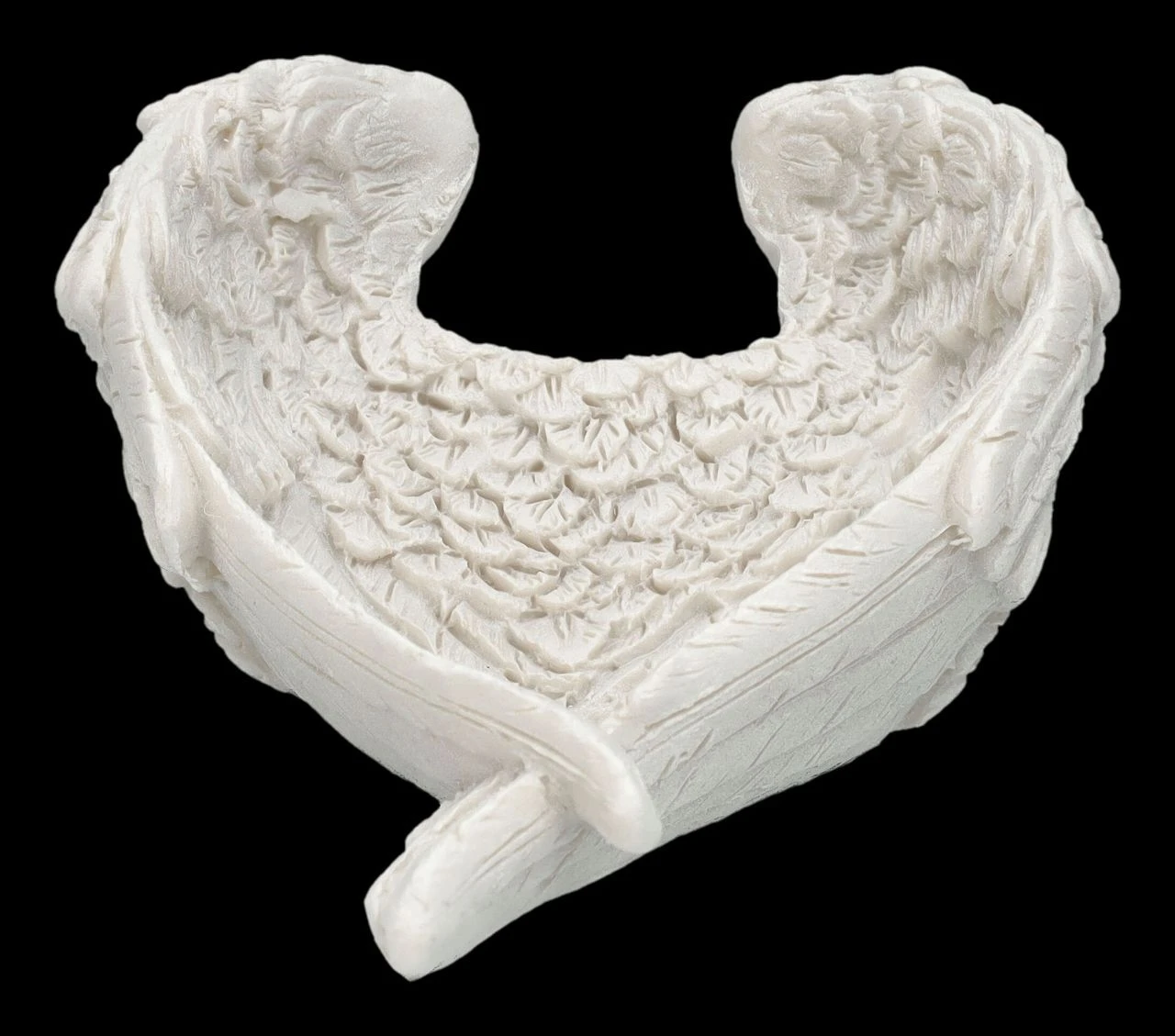 Diese weißen Engelsflügel aus liebevoll handbemaltem Kunststein (Polyresin) bilden eine hübsche Schale, in der zum Beispiel am Abend die Schmuckstücke abgelegt werden können. Die 3 cm hohe, 7 cm breite und 8,5 cm tiefen sehr detailreichen Engelsflügel sind aber auch ein zauberhaftes Geschenk. Unsere Dekoration.ist in der Lieferung nicht enthalten!