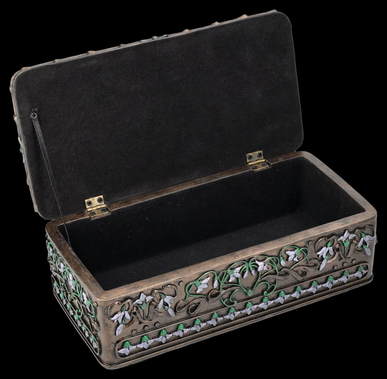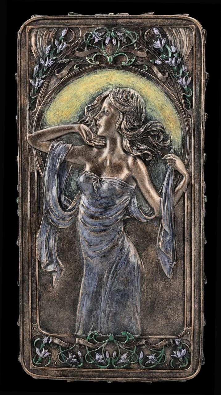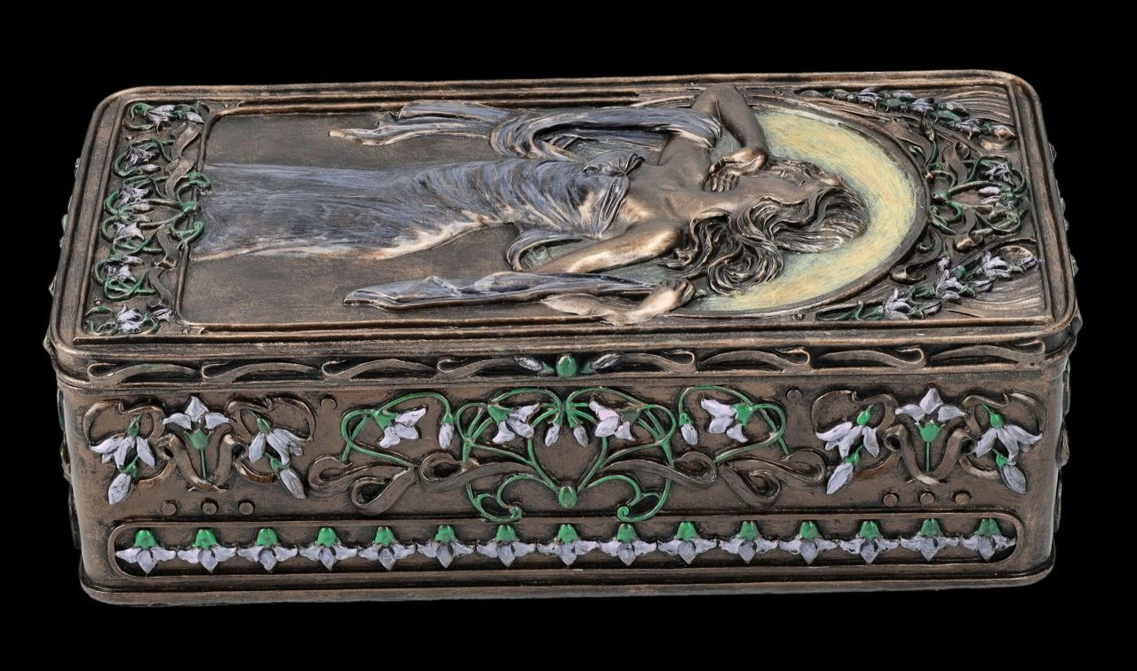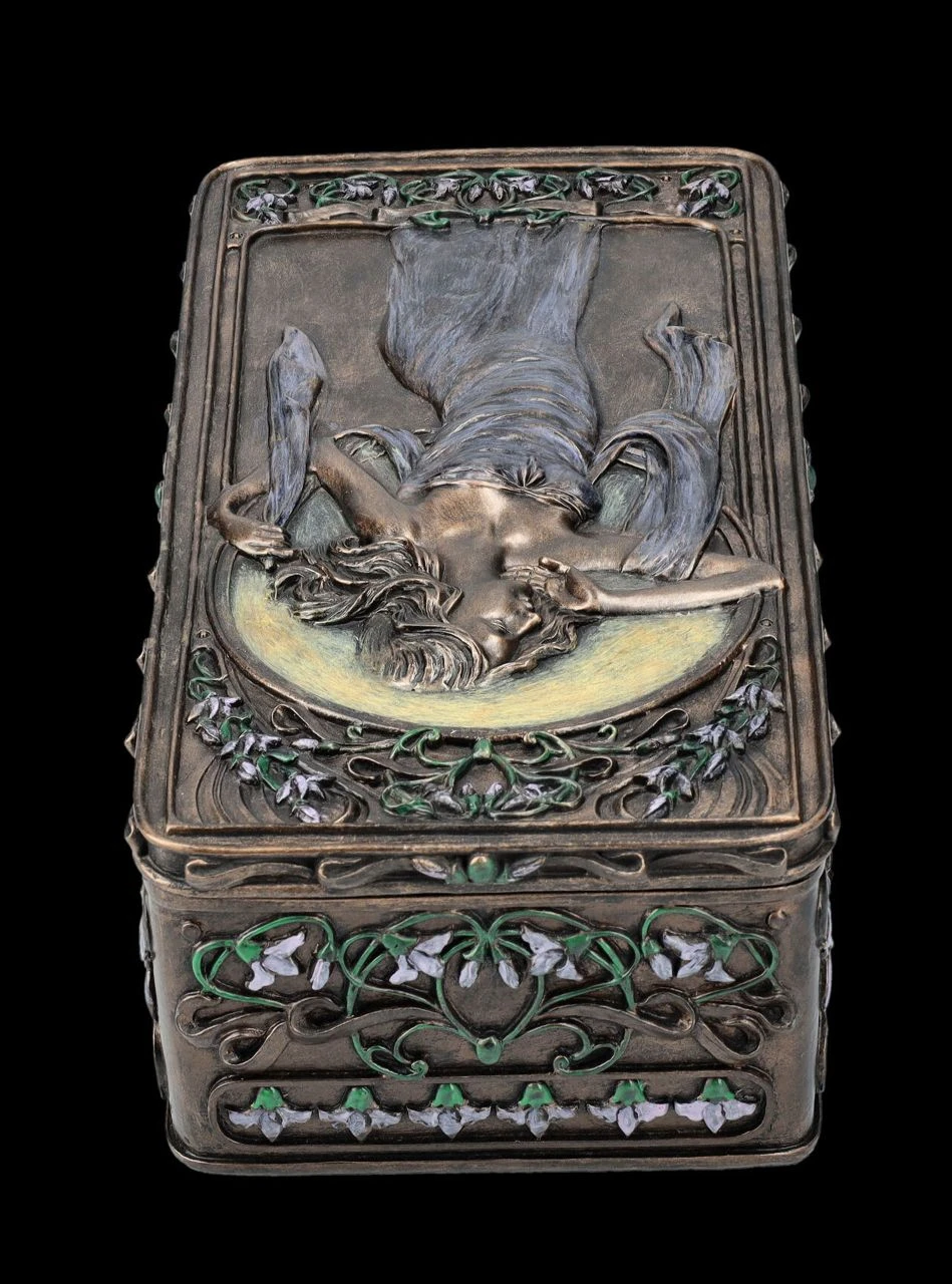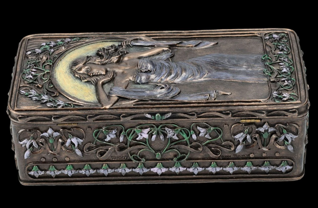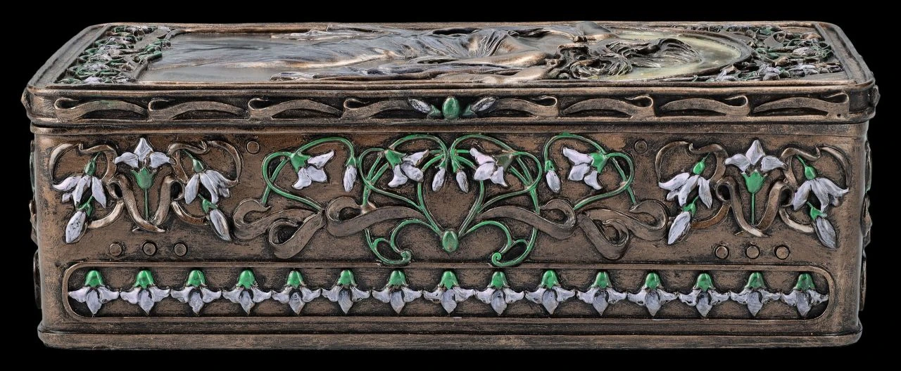 Florale und ornamentale Linien und wunderschöne Frauengestalten in fließenden Kleidern werden heute als Kennzeichen der Kunstrichtung um die Jahrhundertwende vom 19. zum 20. Jahrhundet erkannt. Jugendstil, oder auch Art Nouveau wie diese Epoche in Frankreich genannt wurde, war die Abkehr der bis dahin geltenden Regeln für bildende Kunst und so enstanden zwischen 1890 und 1910 nicht nur in Frankreich und Wien, sondern in zahlreichen ‚Künstlerenklaven‘ u.a. viele der heute berühmten dekorativen Gemälde und Skulpturen. Auf dieser wunderbaren Schatulle im Stil des Art Nouveau ist auf dem Deckel in graziler Pose ‚Lady Victoria‘ zu sehen. Umrandet wird das Bild, wie im Jugendstil üblich, von Blumenranken und Blüten. Die herrliche, 6,5 cm hohe, 10,5 cm breite und 21 cm tiefe Schatulle aus der Studio Collection von Veronese ist aus Kunststein (Polyresin) und wurde edel bronziert und wunderschön coloriert. Innen hat sie mit H: 5 cm / B: 8,5 cm / T: 19 cm ausreichend Platz, um z.B. besondere Erinnerungen oder Kostbarkeiten aufzubewahren. Diese Schatulle ist aber auch ein sehr dekoratives und schönes Geschenk oder auch eine perfekte Geschenkverpackung für etwas ganz Besonderes.