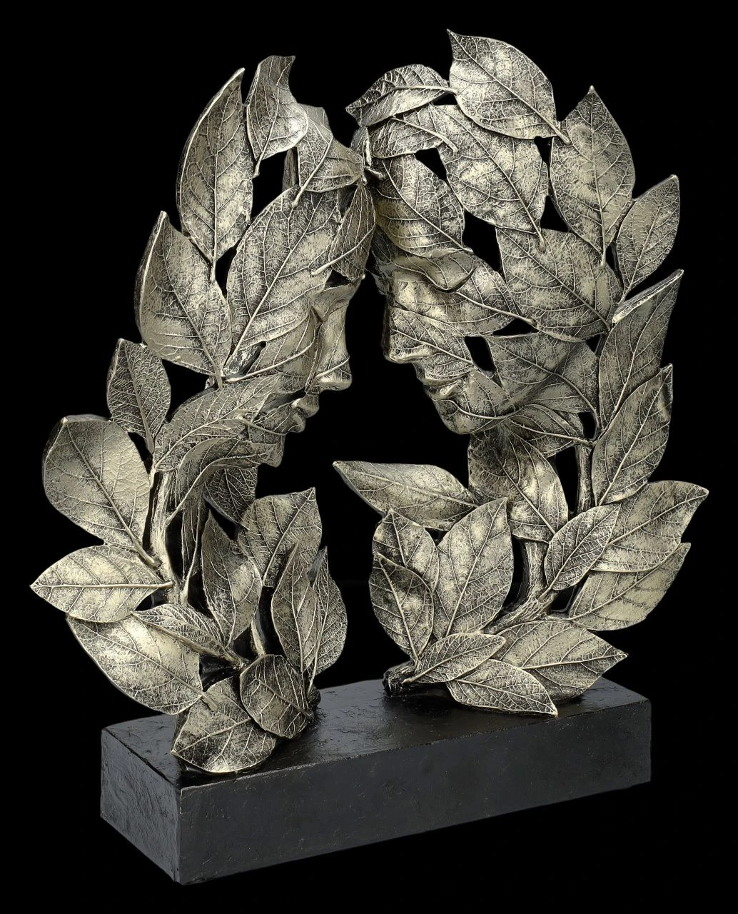 Aus zarten und filigranen Blättern entwickeln sich bei genauem Hinsehen zwei sich hingebungsvoll mit geschlossenen Augen zugeneigte Köpfe. Die detailreichen Blätter sind bei dieser zauberhaften Skulptur so raffiniert angeordnet, dass sofort das Gefühl großer Liebe entsteht. Die kunstvolle Skulptur aus Blättern ist mit Liebe zum Detail aus handbemaltem Kunststein (Polyresin) entstanden. Mit dem Podest ist die wunderbare Skulptur 30 cm hoch, 30,5 cm breit und 11 cm tief. Ob Zuhause, im Büro oder in der Praxis, diese wunderbare Darstellung der ‚Natürlichen Emotion – Liebe‘ wird garantiert überall zum sofortigen Blickfang. Sie ist aber auch ein reizvolles und bezauberndes Geschenk für seine Liebste oder den Liebsten und stellt auf faszinierende, künstlerische Art die Liebe als ‚Natürliche Emotion‘ und tiefe emotionale Verbindung dar.