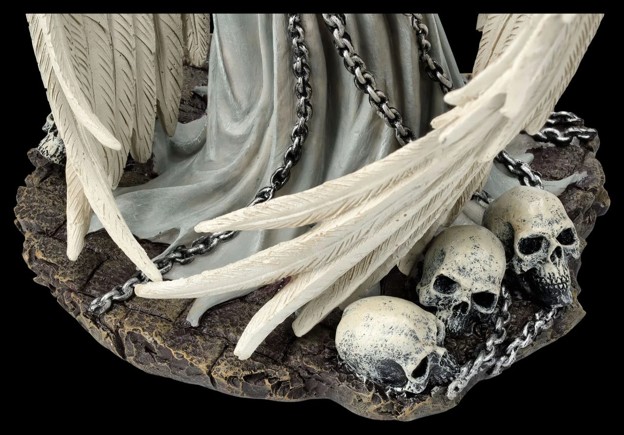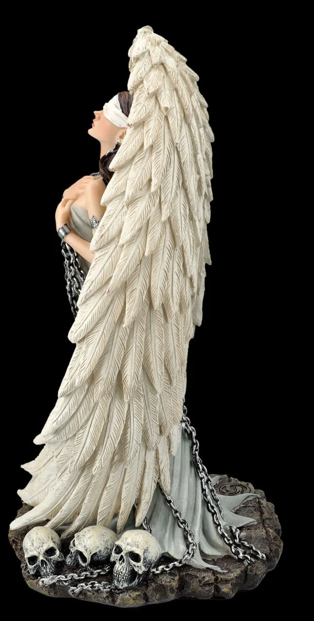 In Ketten gebannt steht dieser bezaubernde Engel da und richtet seine verbundenen Augen erwartungsvoll nach oben. Lediglich die großen Flügel bieten ihm Schutz. Doch denke daran – Engel sind da, um dich zu beschützen und die Gedanken zu befreien. Also verleihe dem inneren Engel Flügel und die Kraft, sich zu befreien. Denn nur wer sich die Augen nicht verschließen und seine Seele und Gedanken nicht in Ketten legen lässt, wird, wie dieser bezaubernde Engel, immer in der Nähe bleiben. Der mit Ketten am Boden gefesselte Engel ‚Captive Angel‘ von Spiral, zu dessen Füßen Schädel auf dem eisigen Boden liegen, ist ein wunderbares Symbol dafür, sich nicht in Ketten legen zu lassen und seinen persönlichen inneren Engel auch selbst nicht in Ketten zu legen. Die schöne und vielsagende Engel-Figur ist bis zu den Einzelheiten und den wunderschönen großen Flügeln detailreich aus liebevoll handbemaltem Kunststein (Polyresin) gefertigt. Der 29,5 cm hohe, 18 cm breite und 16 cm tiefe aufregende Engel ist nicht nur eine perfekte Ergänzung einer Engel-Sammlung, er ist auch ein wunderbares und vielsagendes Geschenk.