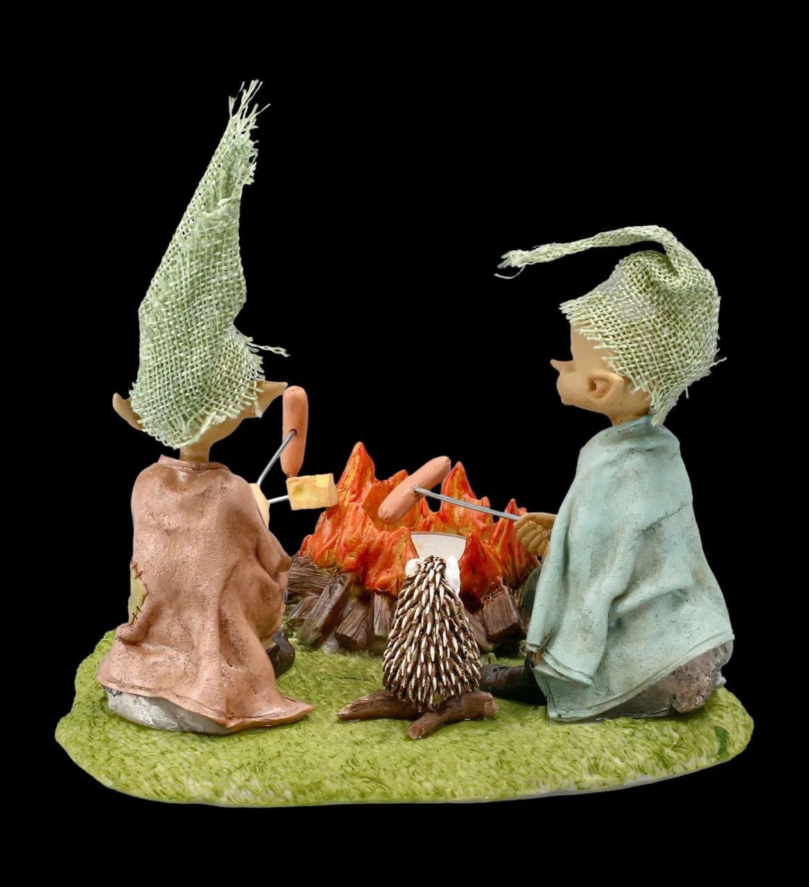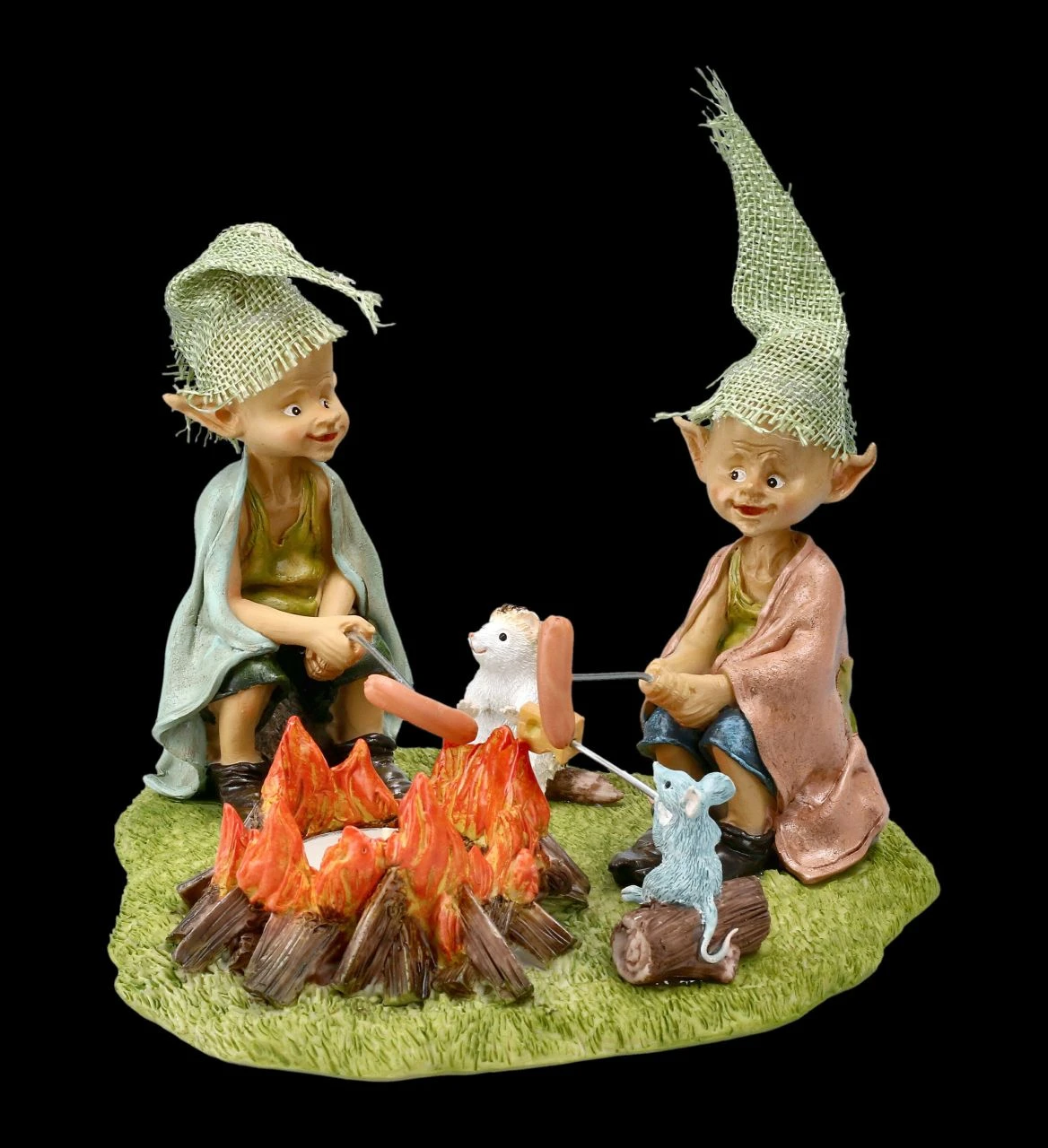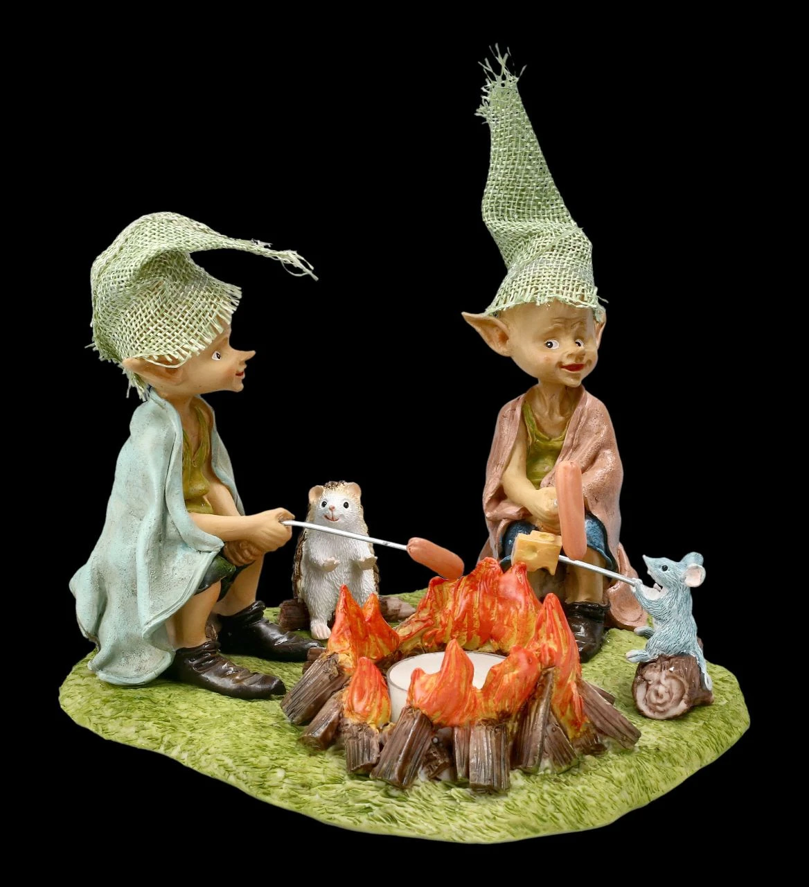 Die vier Freunde sitzen am Lagerfeuer und erzählen sich ihre Abenteuer. Während die beiden frechen Kobolde ihre Würstl an den Spießen ins Feuer halten, hat sich die Maus lieber ein Stück Käse aufgespießt. Nur der Igel wartet darauf, von wem er nun etwas zum Futtern bekommt. Das Teelicht in der Mitte beleuchtet die Szene. Die lustigen Pixie Kobold Figuren am Lagerfeuer sind bis ins kleinste Detail liebevoll handbemalt und aus Kunststein (Polyresin) gefertigt. Der Teelichthalter mit den Kobolden, der Maus und dem Igel ist 13,5 cm hoch, 18 cm breit und 18 cm tief und nicht nur für Sammler von Pixie-Figuren ein besonderes Geschenk. In unserem Shop gibt es übrigens noch weitere lustige Pixie-Kobolde.