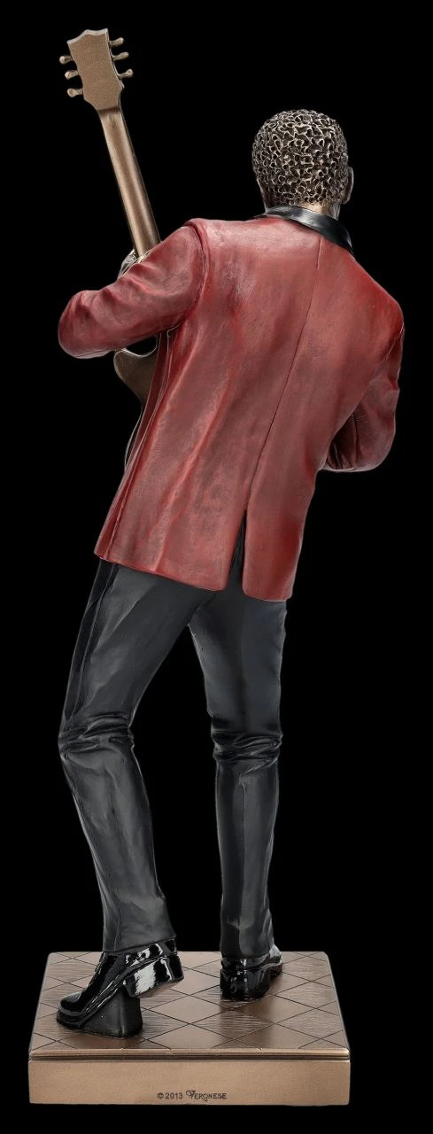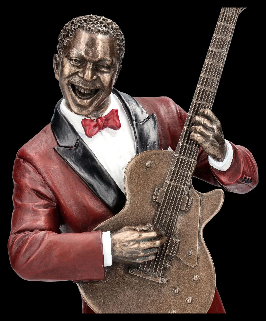 Begeistert von der Musik seiner Band greift der Gitarren-Spieler in die Saiten und singt dazu. Der Gitarren-Spieler aus der Jazz Band ist wunderbar realistisch dargestellt. Ob Swinging Blues oder New Orleans Dixie – man hat fast das Gefühl, dass man mitsingen sollte. In dunkelroter Smoking-Jacke mit schwarzen Aufschlägen, roter Fliege und schwarzer Hose ist der 30 cm hohe, 11 cm breite und 10 cm tiefe Gitarren Spieler aus der Serie der Jazz Band-Figuren in der gesamten Bewegung sehr realistisch dargestellt. Die Figur aus edel bronziertem und wunderbar coloriertem Kunststein (Polyresin) stammt aus der Studio Collection von Veronese. Der Gitarren-Spieler ist – vielleicht auch mit den anderen Jazz-Band-Figuren aus unserem Shop – nicht nur eine perfekte Deko für ein Jazz-Lokal, sondern auch ein tolles Geschenk für einen Jazz-Gitarristen.