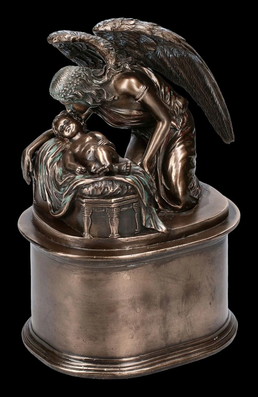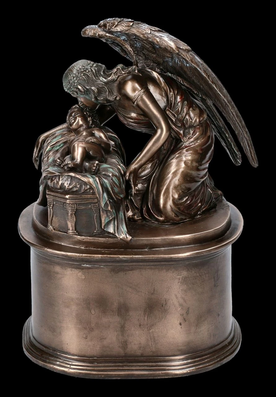 Ihr geliebter, treuer Begleiter hat Sie verlassen, aber gerade wenn die Trauer groß ist, helfen tröstende Gedanken. ‚Beschütze dieses Geschöpf, das von jemandem sehr geliebt wurde, auf seinem Weg in die Ewigkeit‘, scheint dieser wunderschöne Engel dem Jesuskind zuzuflüstern – und dieser Trost soll Sie begleiten! Die detailreich und sorgfältig aus handbemaltem Kunststein (Polyresin) gefertigte Tier Urne mit dem wunderschönen Engel und dem Jesuskind ist.mit der Höhe von 22 cm (Höhe Urne: 9 cm), der Breite von 15 cm und der Tiefe von 12 cm eine wunderbar tröstende Möglichkeit, stilvoll die Asche Ihres Lieblingstieres aufzunehmen. Die Urne hat ein Volumen von ca. 500 ml und Sie können mit ihr immer die Erinnerung an Ihr Lieblingstier vor sich sehen.