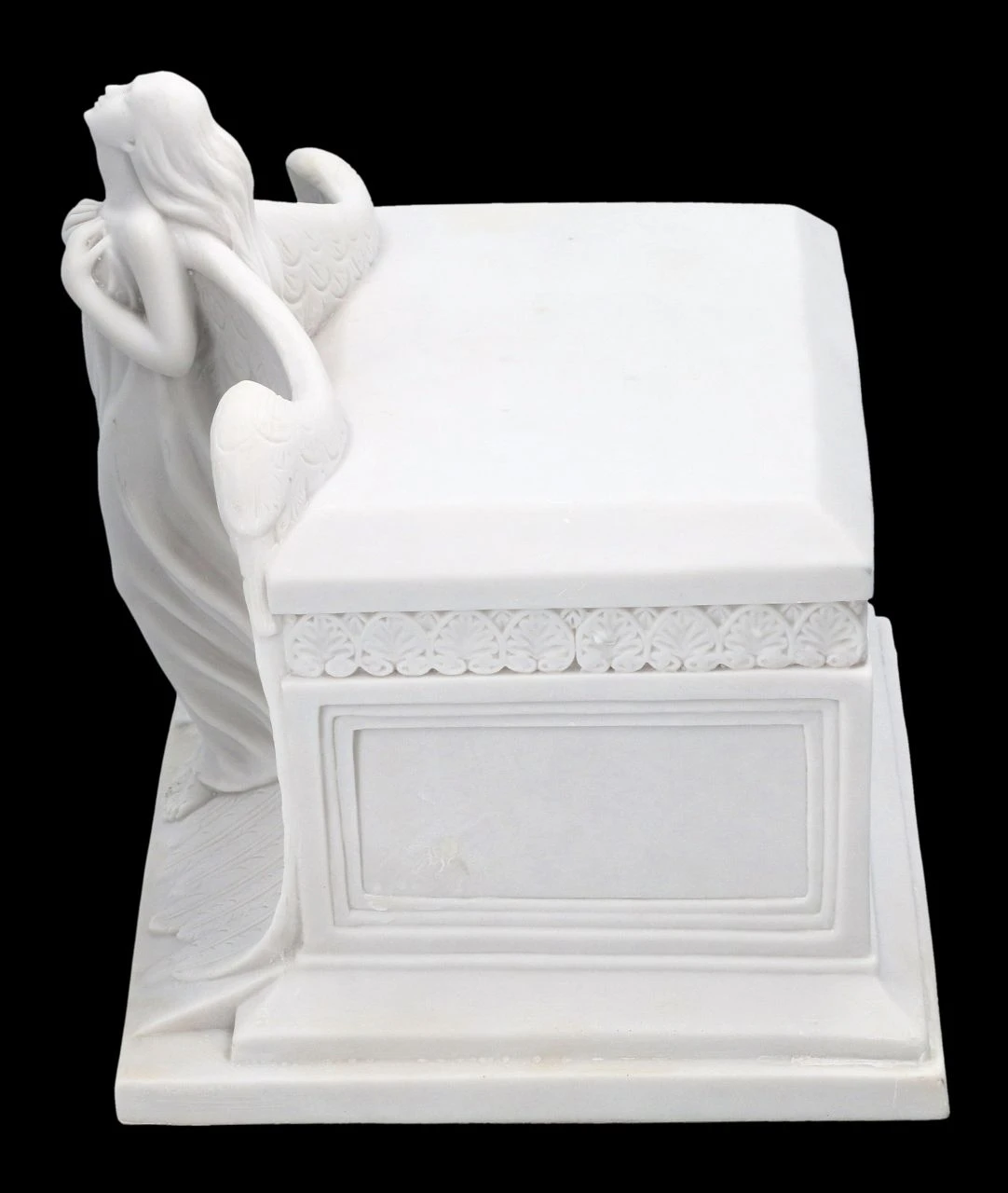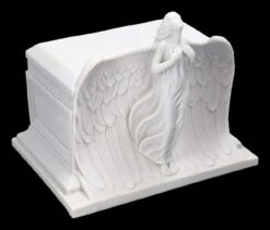 Mit weit ausgebreiteten Flügeln steigt der wunderschöne Engel empor, um die Seele Ihres treuen tierischen Freundes auf der Straße in die Ewigkeit zu begleiten. Die wunderschöne Urne in Form eines Grabmals für Ihren treuen Begleiter spendet Ihnen mit dem zauberhaften Engel sicher Trost, denn Sie spüren, dass auch Sie in Ihrer Trauer nicht allein gelassen werden. Der hinreißende Engel als himmlisches Wesen wird Ihnen zeigen, dass sich Ihr Liebling in guten Händen befindet! Die detailreich und sorgfältig aus handbemaltem Kunststein (Polyresin) gefertigte Tier Urne wirkt durch ihre schlichte weiße Farbe sehr edel. Mit der Höhe von 24 cm (Höhe Urne: 15 cm), der Breite von 27 cm und der Tiefe von 20,5 cm kann die beeindruckende Urne mit dem Engel wunderbar stilvoll die Asche Ihres Lieblingstieres aufzunehmen. Die Urne hat ein Volumen von ca. 3 Liter und Sie können mit ihr immer Ihren Schutzengel und die Erinnerung an Ihr Lieblingstier vor sich sehen.