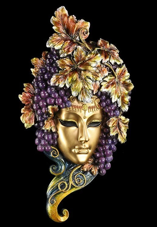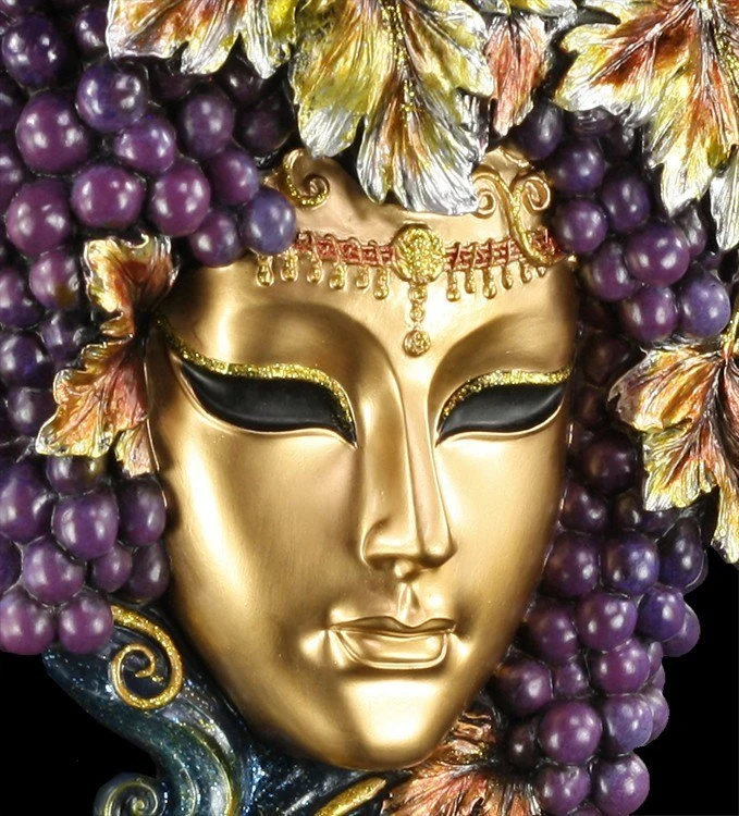 Was gibt es geheimnisvolleres als eine venezianische Maske. Sie verhüllt die Identität und lässt so der Fantasie viel Spielraum. Die farbenfroh mit Trauben und Weinblättern geschmückte Maske, Bacchus, bringt die Mystik eines venezianischen Maskenballs in Ihre Wohnung.