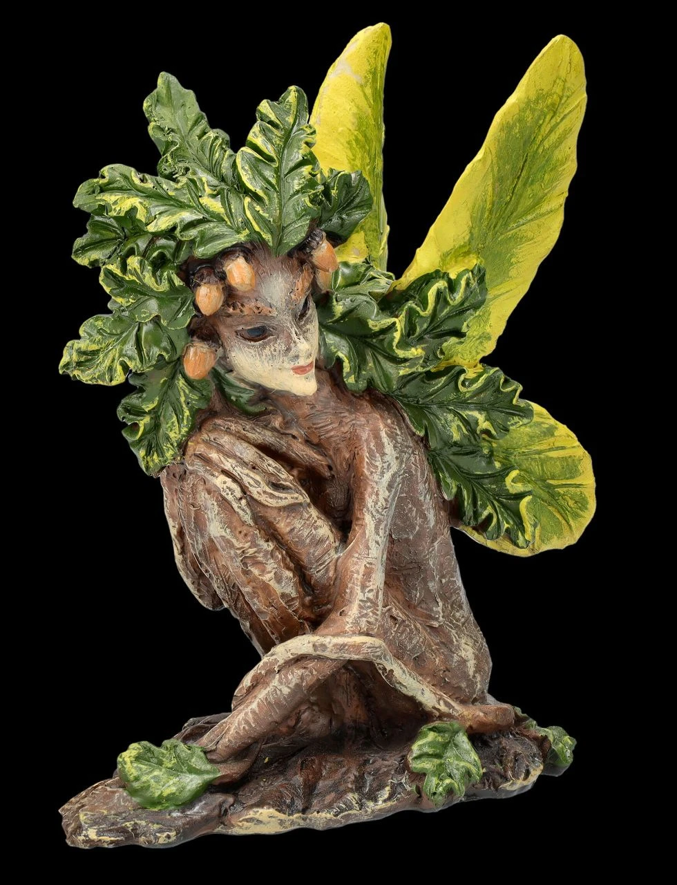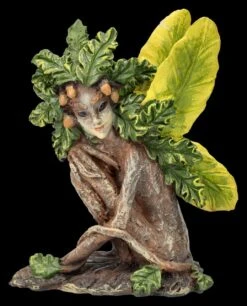 Wer aufmerksam durch den Wald geht, kann sie vielleicht entdecken – die kleine Waldfee Aiken. Auch wenn sie sich gut mit den Eichenblättern und den Eicheln getarnt hat. Aiken, die kleine Waldfeen-Figur mit den zarten Blätterflügeln scheint aus der Wurzel eines alten Baumes gewachsen zu sein. Die 12 cm hohe, 10,5 cm breite und 6 cm tiefe niedliche Waldfeen-Figur wurde aus liebevoll handbemaltem Kunststein (Polyresin) gefertigt. Sie ist ein zauberhaftes Geschenk für alle, die den Wald lieben und freut sich auf einen Platz zwischen den Pflanzen auf der Blumenbank, wo sie sich gut tarnen kann.