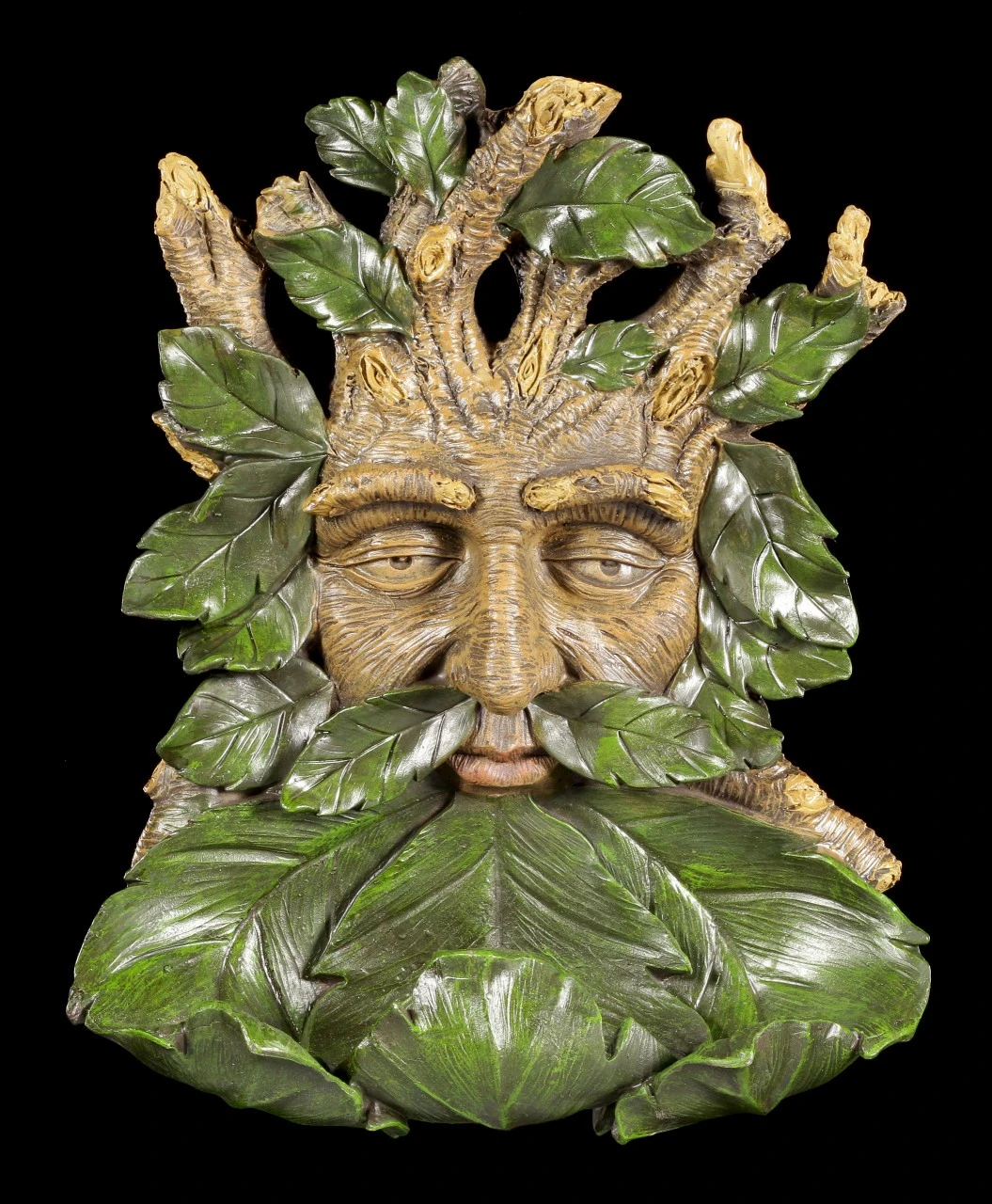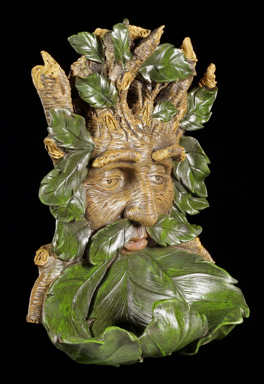 Das Waldgeist Wandrelief „Fütterer des Waldes“ wurde aus hochwertigem Kunststein gefertigt und im Anschluss handbemalt. Das Wandrelief zeigt einen Waldgeist in Form eines Baumgesichts mit Blättern als Bart und Haar. Mit Blättern bewachsene Äste bilden seine Haare und die Blätter umranden sein Gesicht. Die Unterseite seines Blatt-Bartes ist angehoben. Sie bildet so eine Schale für kleine Gegenstände oder auch für Vogelfutter. Seine weises Gesicht mit den klugen und ruhigen Augen werden dabei liebevoll auf die Vögel blicken, wenn sie sich ihr Futter holen.