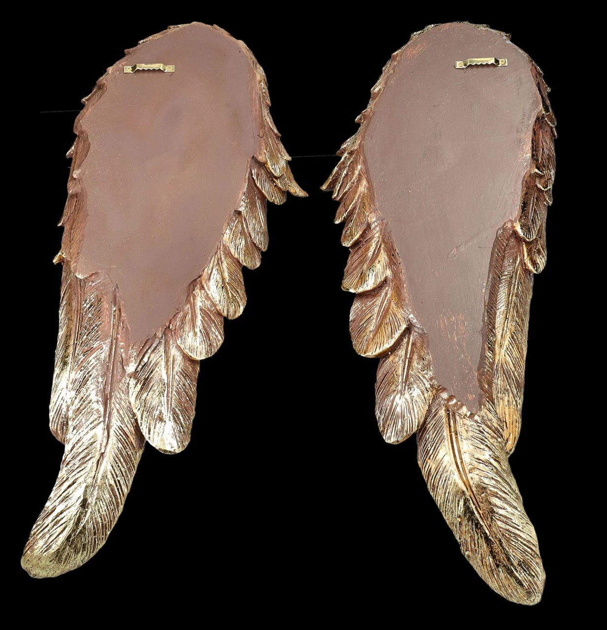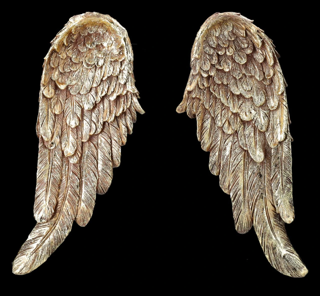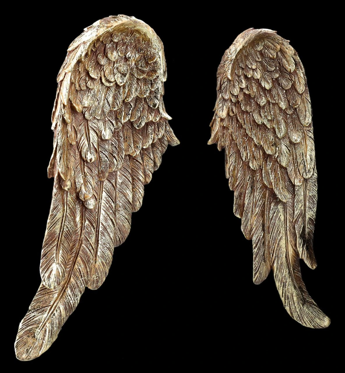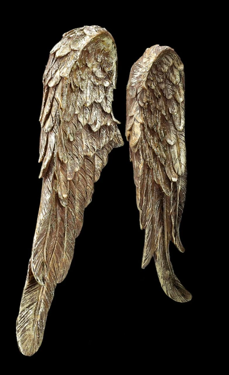 Ein edler Wandschmuck sind diese detailreichen und goldfarben handbemalten großen Engelsflügel. Sie sind rin wunderbares Geschenk für liebe Freunde, denen man einen ganz besonderen Schutz wünscht. Denn schon Martin Luther sagte: ‚Wer einen Engel zum Freund hat, braucht die ganze Welt nicht zu fürchten’…. Die goldfarbenen Engelsflügel aus hochwertigem Kunststein (Polyresin) sind je 46 cm hoch, je 18 cm breit und je 5 cm tief. Sie sind eine wirklich zauberhafte Wanddeko zum Hängen, die im Schlafzimmer aufgehängt sicherlich auch den Träumen Flügel verleiht.