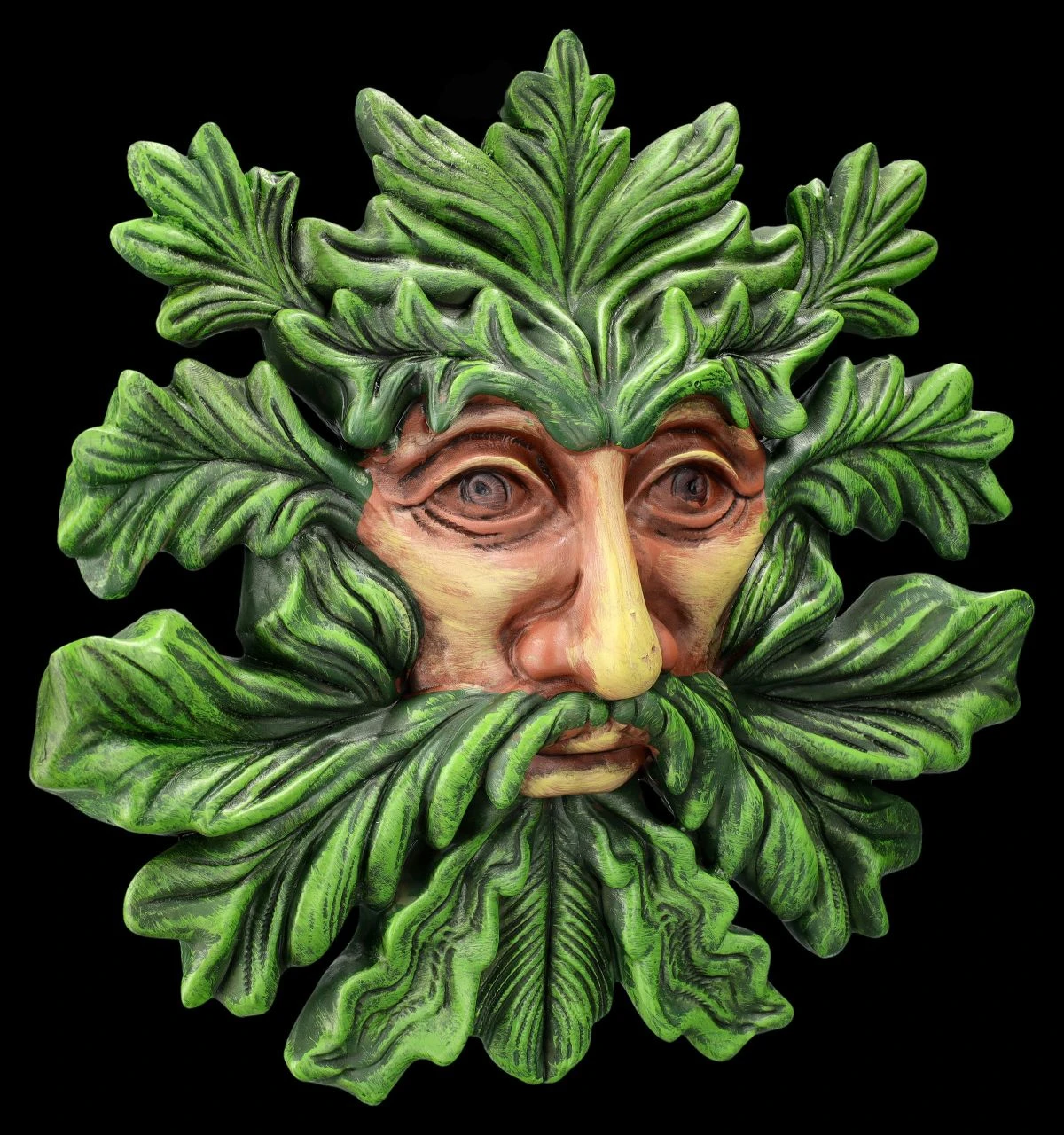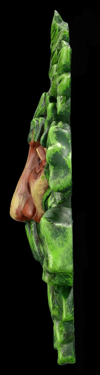 Grüne Blätter bilden Haare und Bart des Blatt-Bärtigen Greenman bei diesem symbolhaften Wandrelief. Es zeigt das ernst blickende Gesicht des Greenman, der auch als ‚Gott mit den Blättern‘ bezeichnet wird. Als spirituelles Symbol, das die Harmonie von Geist und Natur verkörpert, ist dieses Wandrelief auch ein wunderbares Geschenk. Das 18 cm hohe, 19,5 cm breite und 2,5 cm tiefe Wandrelief zum Hängen ist detailreich aus Kunststein (Polyresin) gegossen und wurde von Hand bemalt.