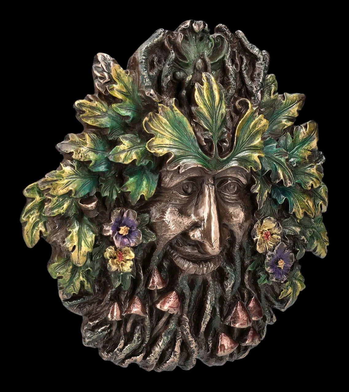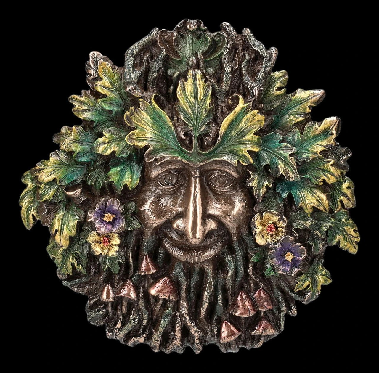 Als Symbol der Vegetation, die sich immer wieder erneuert, wurde der ‚Grüne Mann‘ schon seit Urzeiten als einer der Vegetations- oder Schöpfungsgötter so verehrt, dass er später sogar auf den Kirchen als Zierde angebracht wurde. Bei diesem wunderbaren Wandrelief aus der Studio Collection von Veronese zeigt der Greenman, umgeben von grünen Blättern und bunten Blüten, ein fröhliches Gesicht. Das 13 cm hohe, 13,5 cm breite und 2 cm tiefe Wandrelief aus edel bronziertem und schön coloriertem Kunststein (Polyresin) stellt den Greenman als Symbol der Tag- und Nachtgleiche im Frühling dar. Gemeinsam mit den Motiven der Sommer-Sonnenwende, der Herbst Tagundnachtgleiche und der Winter-Sonnenwende aus unserem Shop, aber auch einzeln, ist dieses Wandrelief eine symbolhafte Deko und ein perfektes Geschenk für alle Freunde des Grünen Mannes.