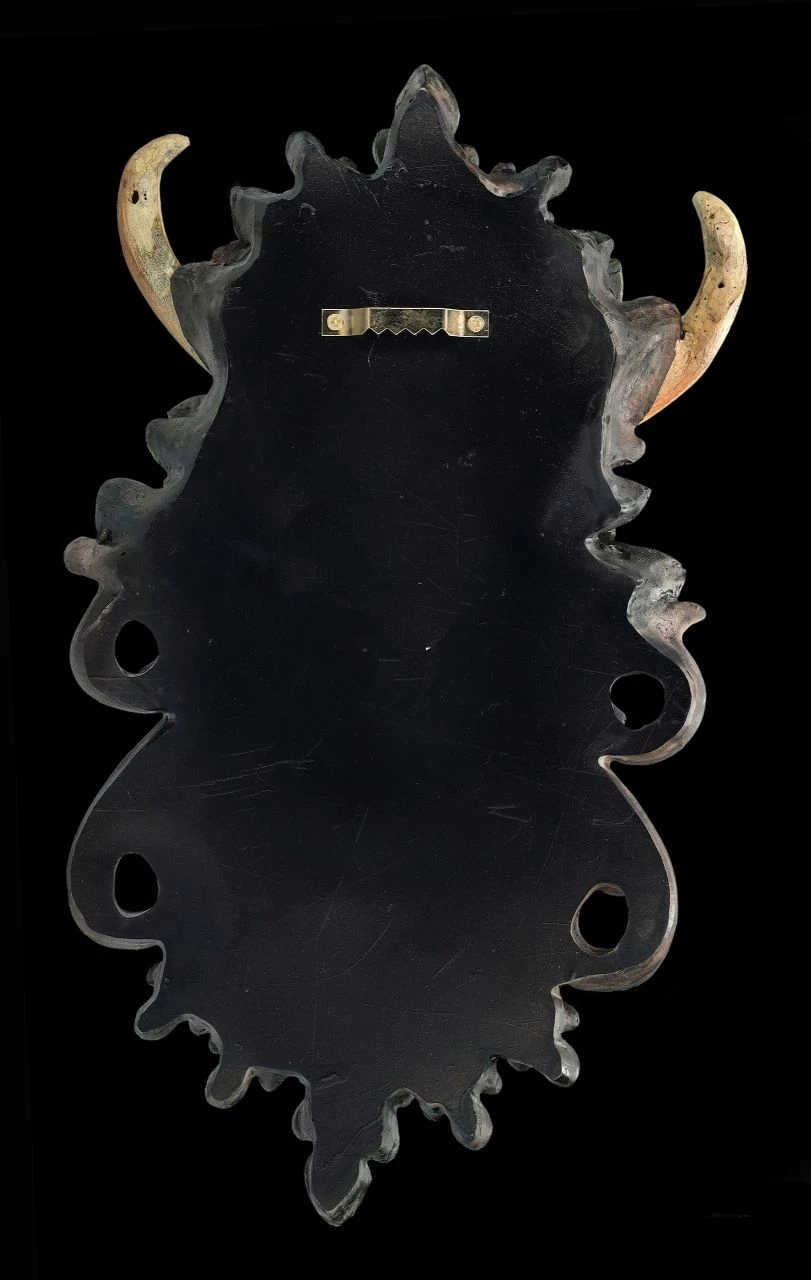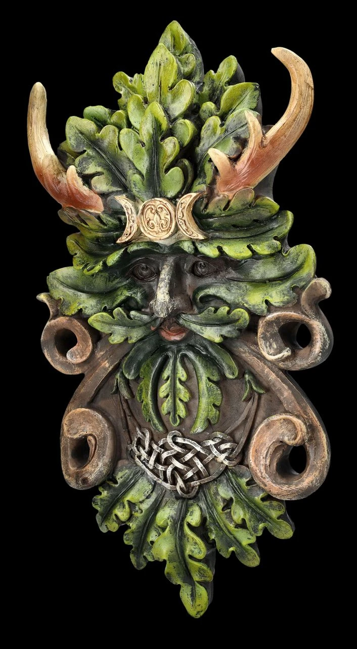 Dass der Greenman auch bei den Kelten zu den Vegetationsgöttern gehörte, ist diesem Wandrelief anzusehen. Das mit zahlreichen grünen Blättern umrandete Gesciht wurde bereits in vorchristlicher Zeit oft als spirituelles Symbol für das Werden und Vergehen in der Natur dargestellt. Auch in der mittelalterlichen Kunst, wie z.B. auf alten Kirchen, findet man immer wieder die Darstellung des ‚Grünen Mannes‘ oft auch als ‚gehörnten Naturgott‘, wie bei diesem 29,5 cm hohen, 16,5 cm breiten und 4 cm tiefen Wandrelief zum Hängen. Es wurde aus handbemaltem Kunststein (Polyresin) gefertigt und zeigt das rätselhafte und symbolhafte Wesen mit Hörnern, dem Symbol der Dreifachen Mondgöttin auf der Stirn und einem keltischen Muster auf dem Kinn. Das Wandrelief ist auch ein perfektes Geschenk für alle Anhänger des ‚Grünen Mannes‘, aber auch für alle, die von der Wicca-Spiritualität der dreifachen Mondgöttin überzeugt sind.