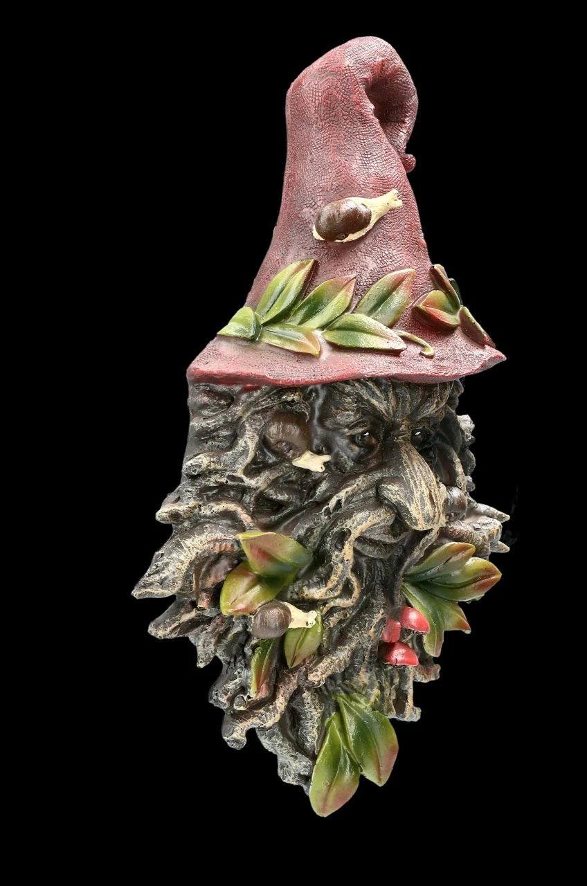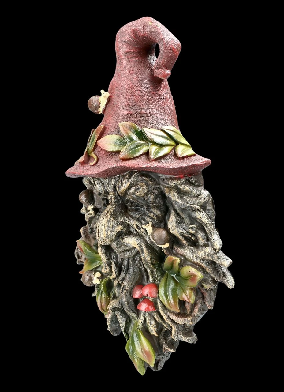 Der Greenman Magier Radagust ist der Schutzgeist der kleinen Waldbewohner. Das zeigen auch die niedlichen Schnecken auf seinem roten Hut.und dem wie aus einer Wurzel geschnitztem Gesicht. Die grünen Blätter und roten Pilze und sein mildes Lächeln zeigen, dass er sich auch an Ihrer Wand wohlfühlt. Das Wandrelief zum Hängen ist aus handbemaltem Kunststein (Polyresin) und 26,5 cm hoch, 17,0 cm breit und 6,5 cm tief.