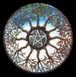Der Lebensbaum, der für Entwicklung, Wachstum, Fruchtbarkeit, Unsterblichkeit und Heilung steht ist auf diesem fantastischen Wandrelief vor leicht bewölktem blauen Himmel in den Farben der Jahreszeiten zu sehen. Das Zentrum in der Mitte bildet ein Pentagramm als eines der mächtigsten Schutzsymbole Das wunderbare Wandrelief hat einen Durchmesser von 19,5 cm und eine Tiefe von 1,5 cm. Es wurde sorgfältig aus Kunststein (Polyresin) gefertigt und liebevoll handbemalt. Das fantastische Wandrelief mit dem magischen und spirituellen Symbol des Lebensbaumes im Zeichen der Jahreszeiten ist zum Hängen. Es ist nicht nur eine faszinierende Deko, sondern auch ein wunderbares Geschenk für einen lieben Menschen..
