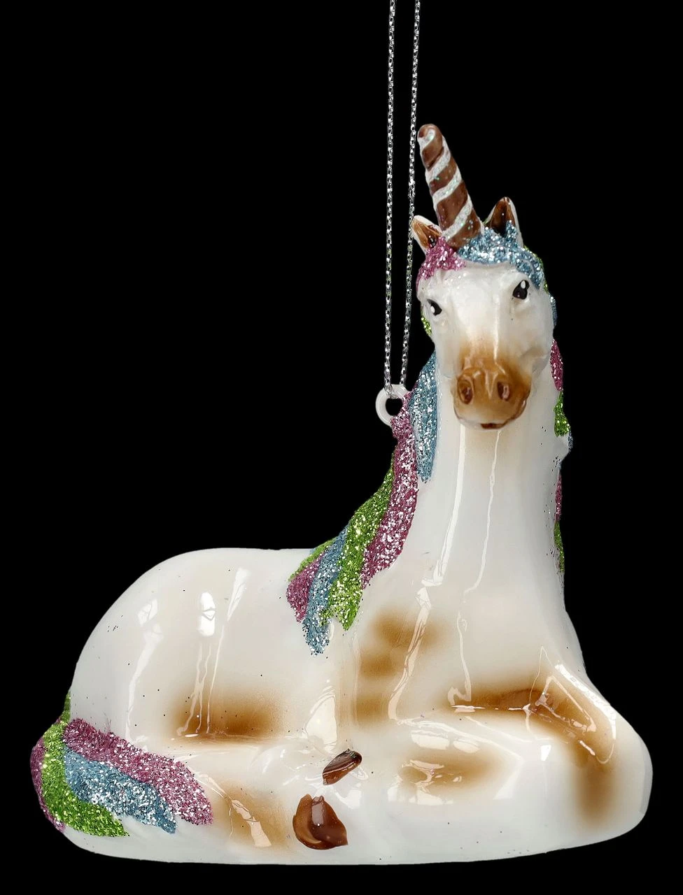 Einfach bezaubernd ist dieses mundgeblasene und von Hand bemalte Einhorn aus Glas als Weihnachtskugel. Ganz ruhig liegt es da und scheint alles zu beobachten und die weihnachtliche Magie zu genießen. Diese Weihnachtskugel ist ein zauberhafter Schmuck am Weihnachtsbaum oder an einem Zweig. Das 9,5 cm hohe, 9,5 cm breite und 5 cm tiefe entzückende Einhorn als Weihnachtskugel ist nicht nur für Einhornliebhaber auch ein fantasievolles Geschenk und Mitbringsel. Achtung: Weihnachtskugeln sind als Deko nur für den Innenbereich geeignet und achten Sie bitte darauf, dass die Glaskugeln zerbrechlich sind und nicht als Spielzeug für Kinder geeignet sind. Eine große Auswahl weiterer faszinierender Glaskugeln finden Sie übrigens in unserem Shop.