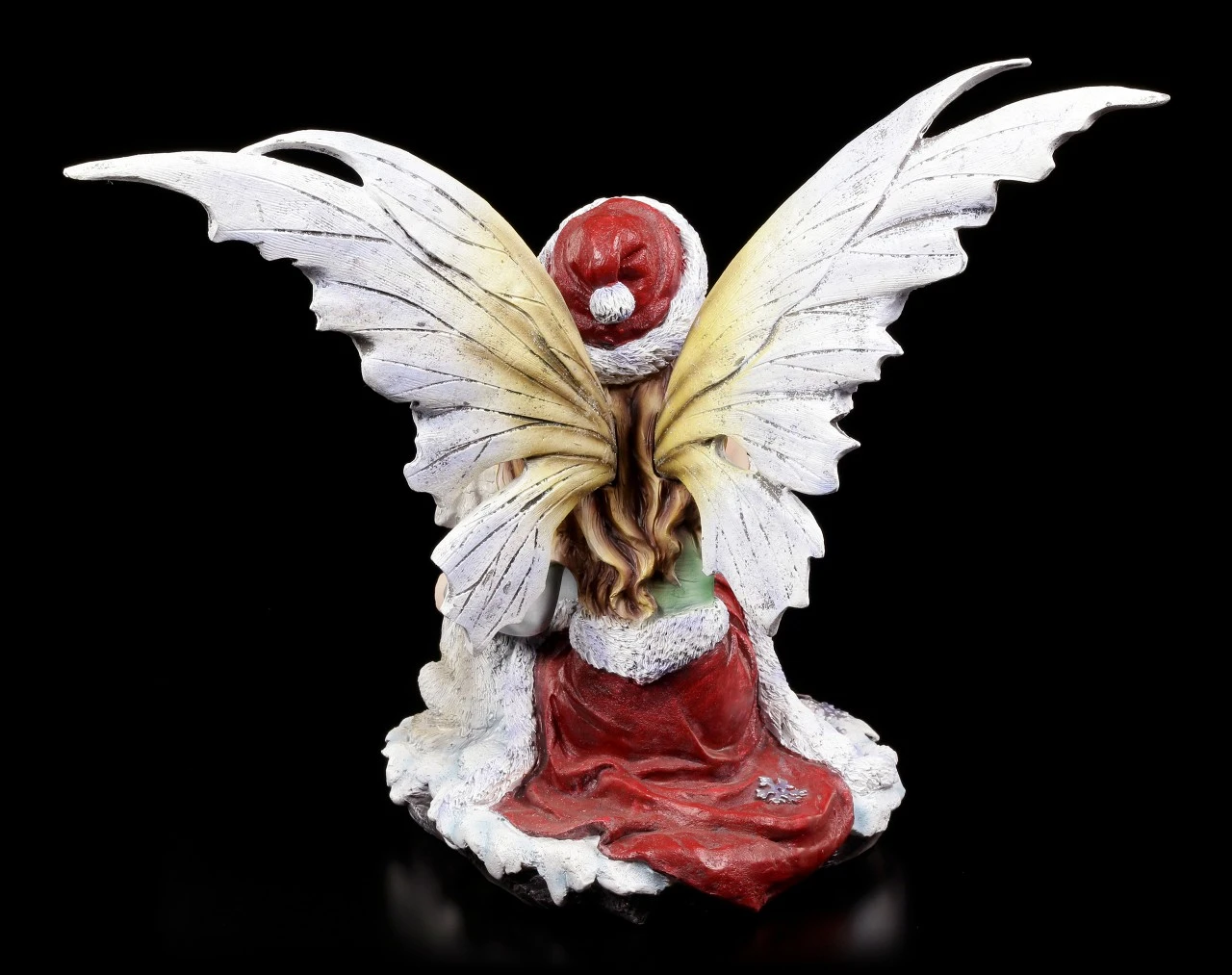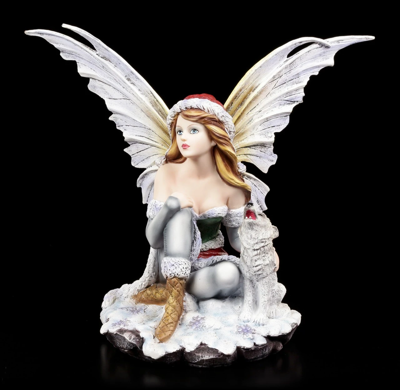 Die Winterelfe Valeriana kuschelt mit ihrem Wolf im Schnee. Diese handbemalte Figur bringt das Gefühl der ersten Schneeflocken nach Hause.