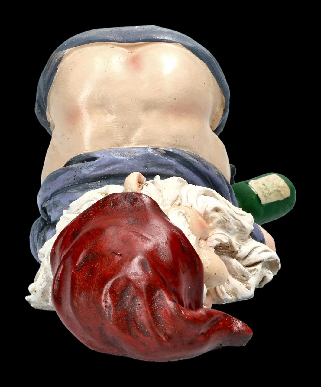 Huch, der Weg von der Waldschänke nach Hause wackelt aber ganz fürchterlich. Da leg ich mich doch lieber hin und warte, bis sich der Weg wieder beruhigt hat. Ein kleines Schläfchen mit süßen Träumen kann nicht schaden, denkt sich dieser kleine lustige Zwerg. Beschwipst hat er sich einfach auf den Waldboden gelegt und ist selig lächelnd eingeschlafen. Dass ihm dabei die Hose verrutscht, ist ihm so was von egal. Diese freche Zwergenfigur ist aus liebevoll handbemaltem Kunststein (Polyresin) gefertigt. Der Zwerg ist 7,5 cm hoch, 17,0 cm breit und 9,0 cm tief und hofft sehr, bei seinem Mittagsschlaf nicht gestört zu werden.