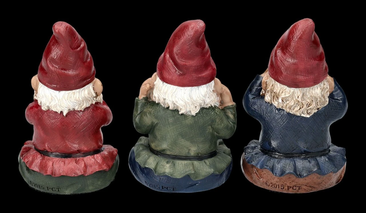 Gartenzwerge für den Schreibtisch, oder doch besser für die Blumen- oder Fensterbank? Sehr witzig – denn die drei Zwerge zeigen jedem deutlich, dass sie nichts Böses hören, sehen und auf jeden Fall nichts sagen wollen. Die drei Zwerge mit den lustigen Gesichtern wurden aus handbemaltem Kunststein (Polyresin) gefertigt. Sie sind jeweils 9,5 cm hoch, je 6 cm breit und je 6 cm tief. Die Zwergen Figuren ‚Nichts Böses…‘ sind aber auch ein vielsagendes Geschenk für Leute mit Humor.